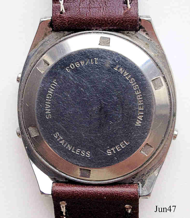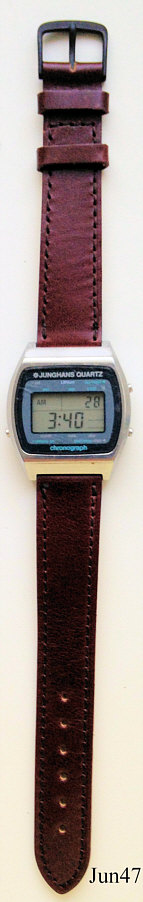 Eine Junghans LCD Digital Armbanduhr in Edelstahl. Inschrift vorn: ”JUNGHANS, Quartz, Chronograph”, hinten: ”Junghans, Stainless Steel, Water Resistant, 11/4903”, innen: “Junghans, 616.10”. Braunes Lederarmband mit schwarzer Schließe. 34 mm Quadratisch.