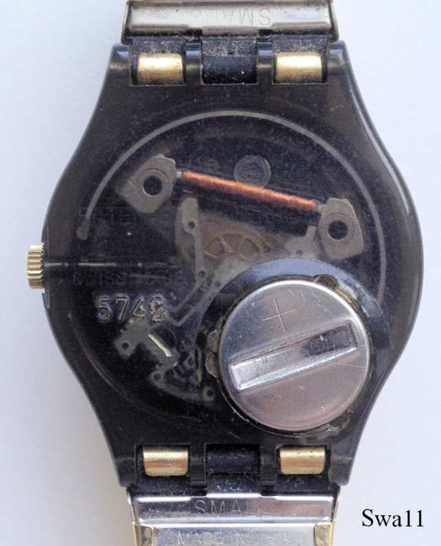 Eine Swatch Quartz Uhr mit Kunststoff Gehäuse und durchscheinender Rückwand, Datum bei der 6, Tag bei der 12. Beschriftet vorn: “Swatch, Swiss”, hinten: ”Patented Water Resistant, Swiss Made, 5742, Battery, 11,60x3,10, 1,55 V”. Goldfarbenes Flex Armband.