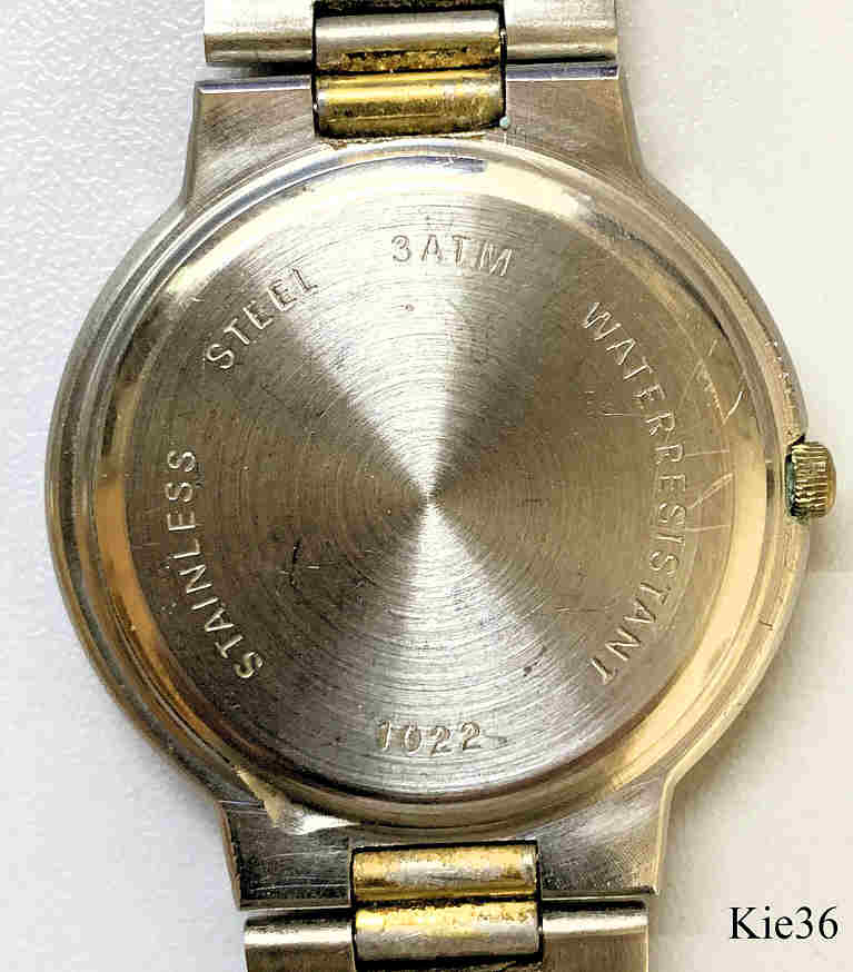Dies ist eine Quartz Armbanduhr von Kienzle. Das Zifferblatt ist silberfarben, Kalender bei der 3. Beschriftet vorn: ”Kienzle, Quartz”, Rückseite: ”Kienzle, 1022, Stainless Steel, 3 ATM Water Resistant”. Gehäuse zweifarbig, Durchmesser 34 mm, bicolor Metallarmband. Kaliber ETA 955.414