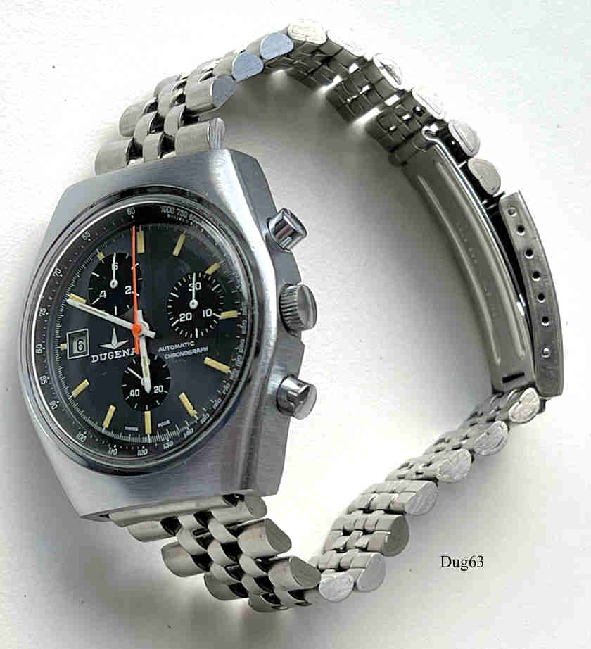 A Dugena Automatic watch, equipped with the very scarce automatic caliber Kelek 1369 with date at 9. The movement is a collaboration of four companies: Tenor-Dorly developped together with Brac the basic movement TDB 1335 and combined it with the chronograph module of Dubois-Dépraz, therefor the crown and the pushers are in different levels. Kelek was then responsible for the manufacturing of the 23000 movements. The movement was the smallest chronograph movement in 1974. Signed front: ”Dugena, Automatic, Chronograph”, back: “Stainless Steel Back, Base Metal, Swiss, 524241, 157”, inside: “Seventeen Jewels, K TDB, unadjusted swiss, Dugena, 5200, Seventeen, 17 Jewels, Unadjusted, Swiss”, Kaliber Kelek 1369. Stainless Steel band.