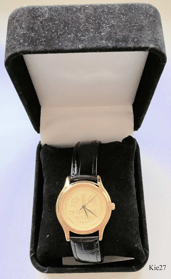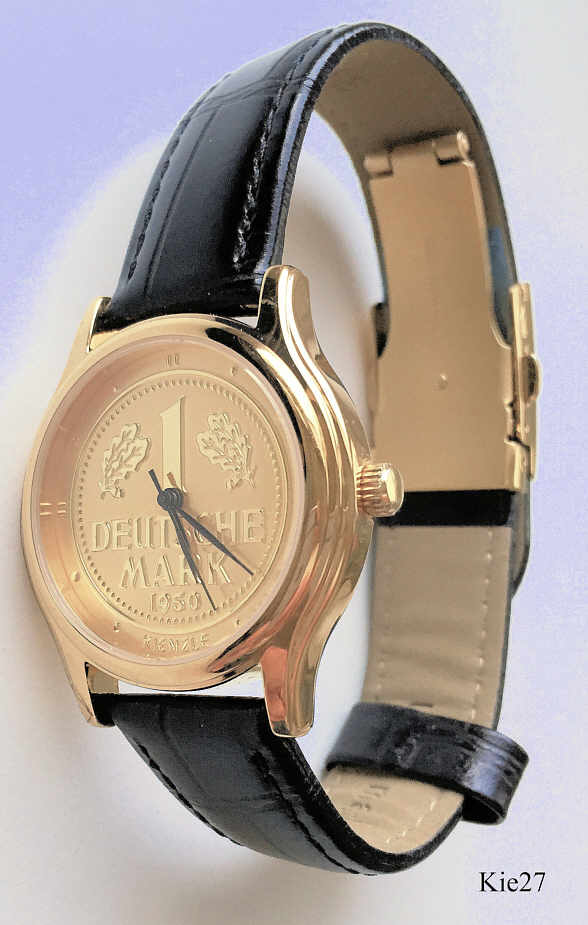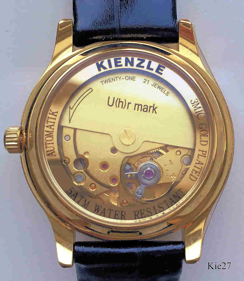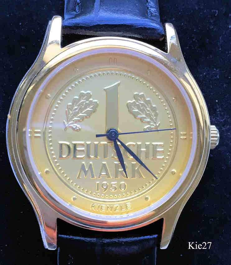 A Kienzle automatic watch to commemmorate the German Mark. Signed front: ”1 Deutsche Mark, 1950, Kienzle”, back: ”Kienzle, Twenty-One 21 Jewels, U(h)r mark, 3 Mic Gold Plated, 5 ATM Water Resistant, Automatic”. Base Metal case, 3 micron gold plated with glass bottom. Caliber Miyota 8215.