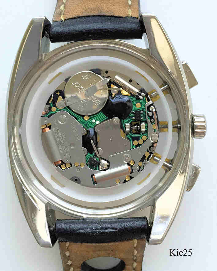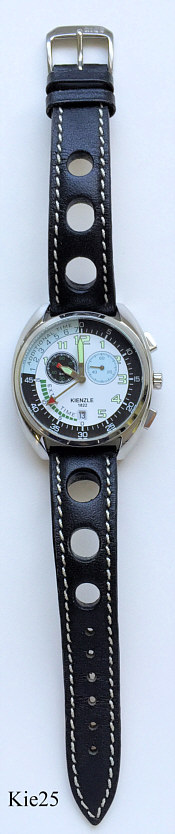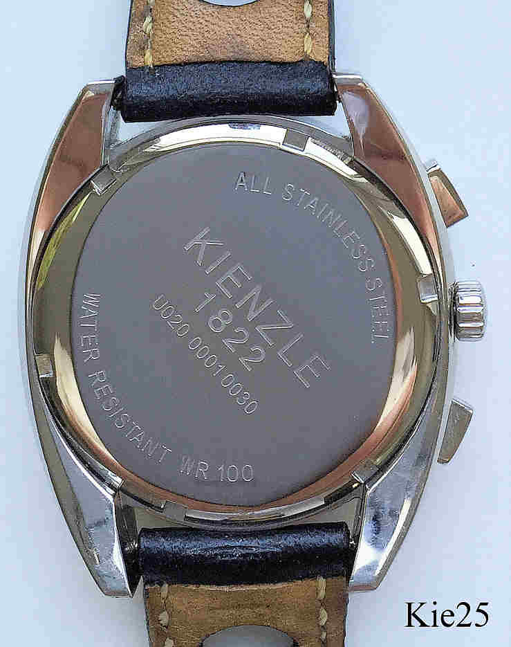 A Quartz Sport chronograph by Kienzle with Alarm Function. Calendar at 6. Signed front: ”Kienzle, 1822 ”, back: ”Kienzle 1822, U020 0001 0030, All Stainless Steel, Water Resistant WR100”, inside: “Prestige Time Co Ltd.,Swiss Parts Movement China, Three 3 Jewels, ISA 8271”. Stainless Steel case, black sporty Leatherband.