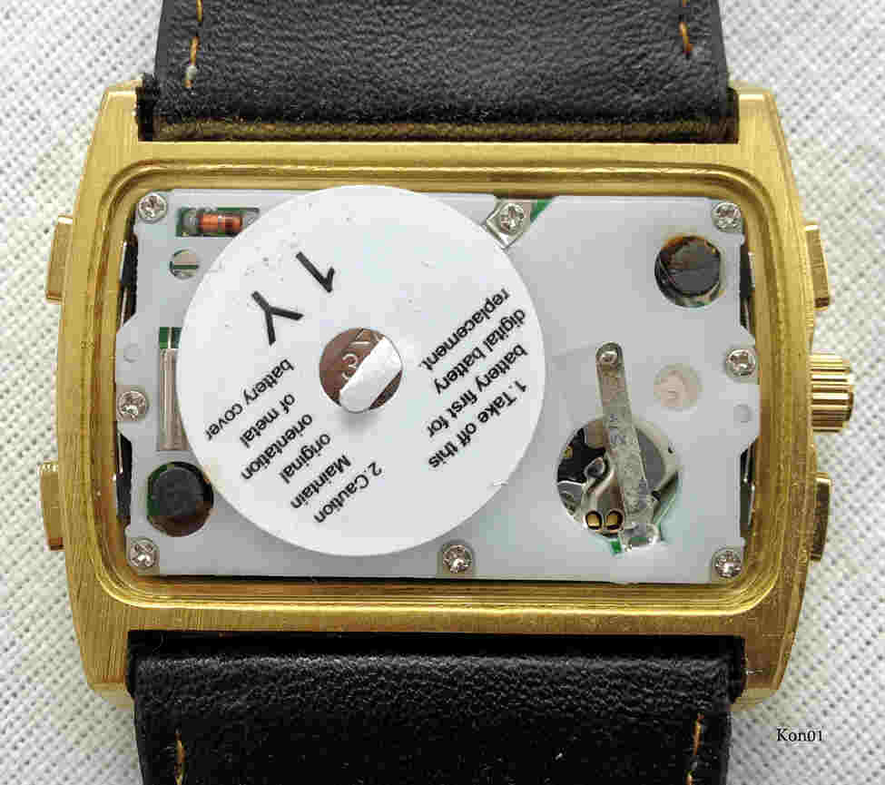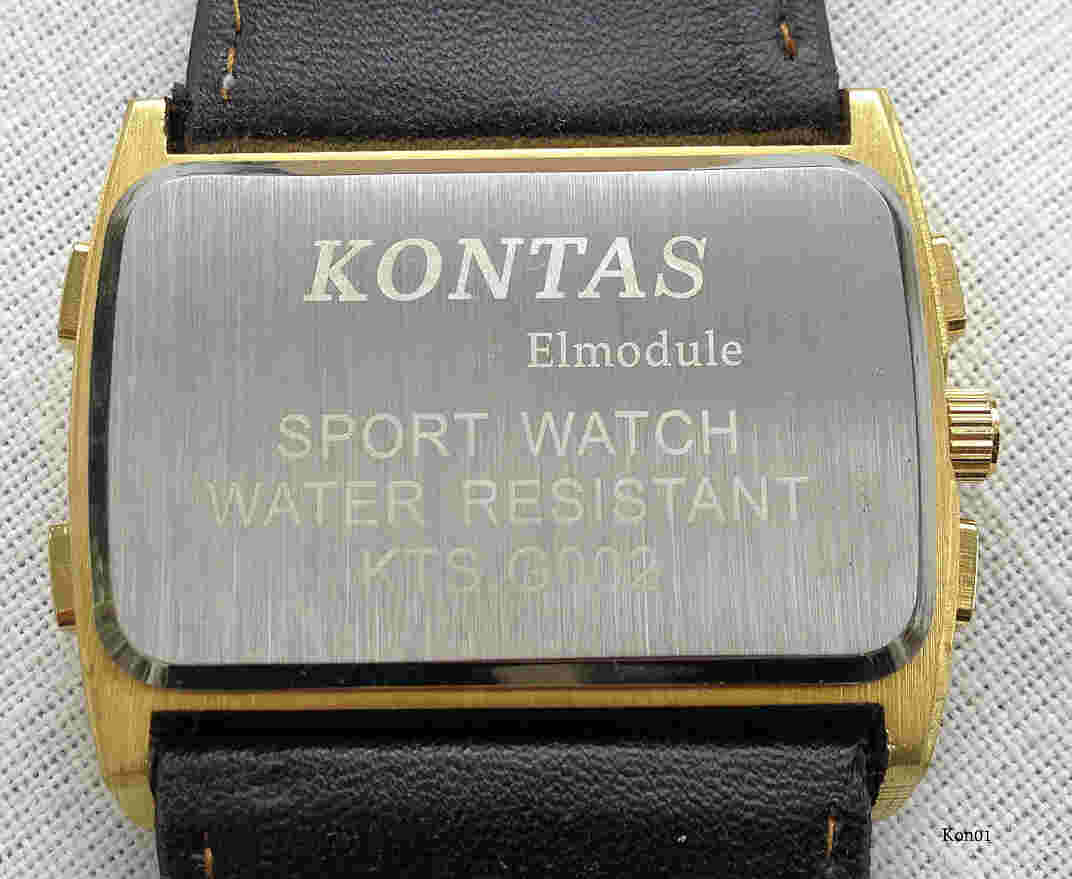 An Ana-Digi watch of Guangzhou Weisheng Watch Co., brand Kontas.An analog watch with crown left, two digital windows, four pushers. Top left=light, bottom left=Mode, top right=start/stop, bottom right=reset. Signed front: “ ”, back: ”Kontas Elmodule, Sport Watch, Water Resistant,KTS G002”, inside: “” . |