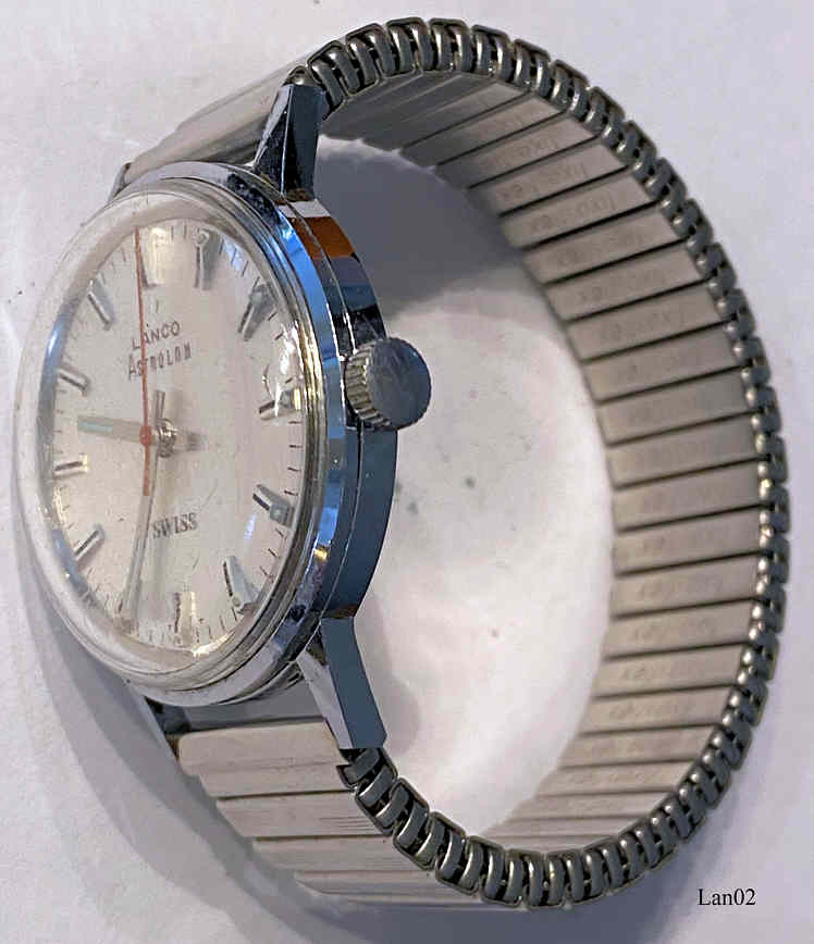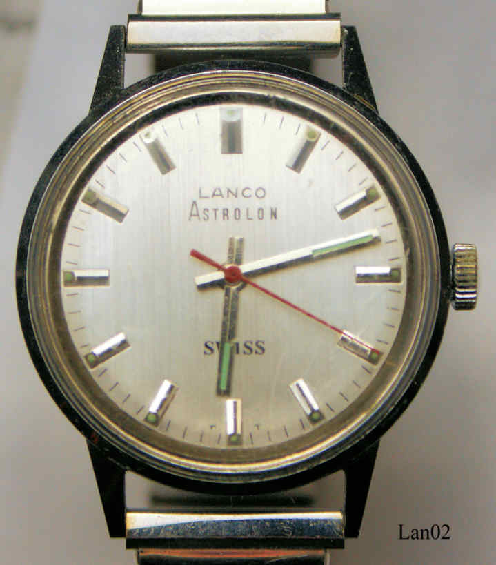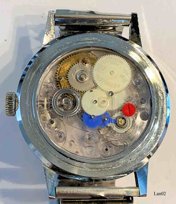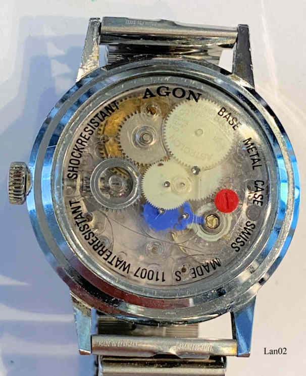 Diese Lanco Astrolon Handaufzugsuhr verwendet das revolutionäre Tissot 512 Werk, das erstmals komplett aus Kunststoff gefertigt ist.. Inschrift: “Lanco, Astrolon, SWISS”, hinten: ”AGON, Base Metal Case, Swiss Made, S11007, Waterresistant, Shockresistant”. Glas Rückwand, somit kann man das Kuststoffwerk gut sehen.