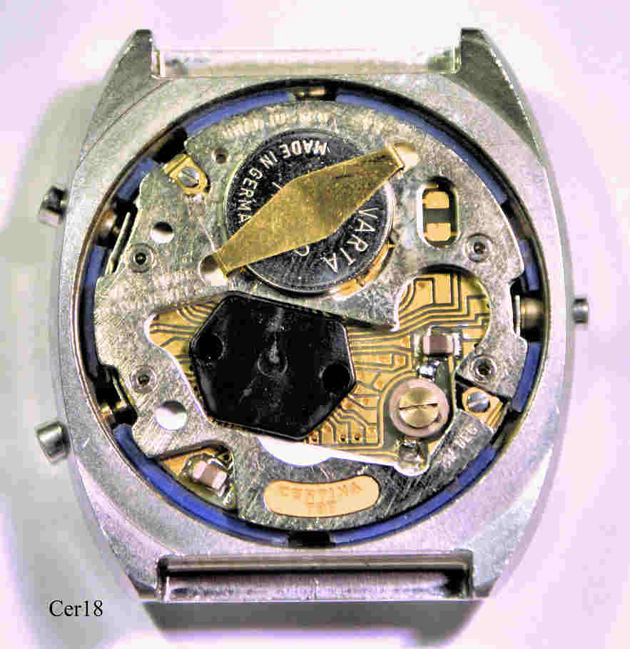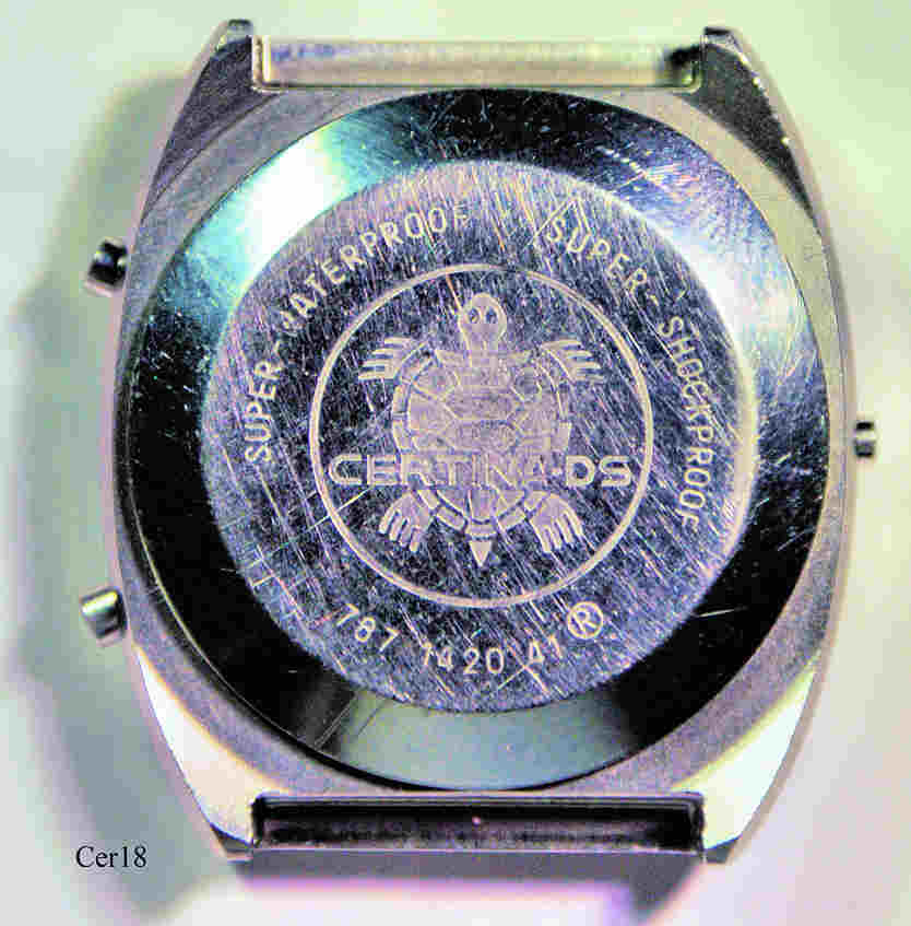 Dies ist eine Certina Chronolympic, eine Digitaluhr mit LCD Display. Beschriftung vorn: ”Quartz, Chronolympic, DS”, hinten: “Certina DS, Super Waterproof, Super Shockproof, 787 142041”, innen: “Unadjusted, No (0) Jewels, Swiss Made, 934 712”, Edelstahl Gehäuse.