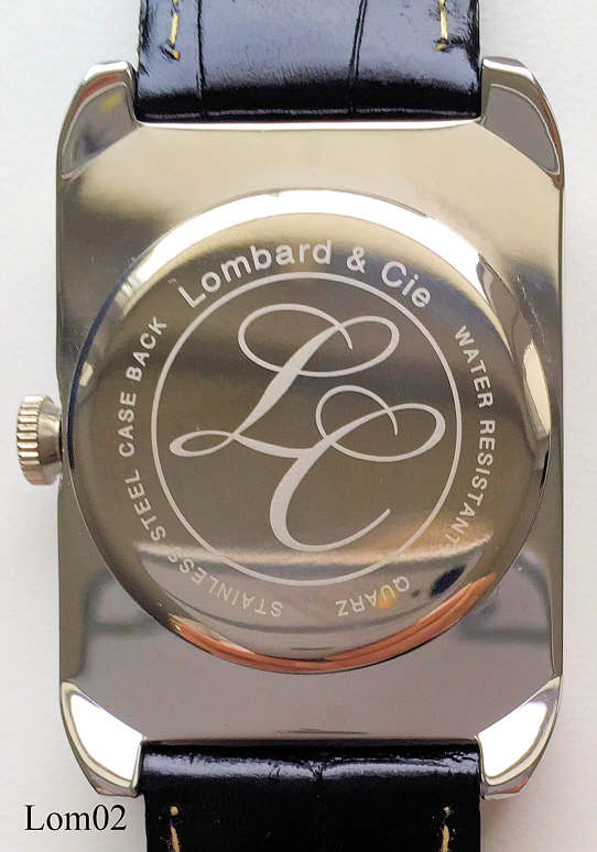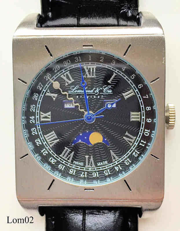A beautiful dresswatch of Lombard&Cie with Kalendar and Moonphase,The windows at 10 show the day, at 2 shows the month and the silver pointer shows the date, the moonphase is displayed at 6. Silver base Metal case. Signed front: “Lombard&Cie, Original, Hand Made”, inside:”6P80, Miyota Co., No Jewels”, back: “Lombard&Cie, Water Resistant, Quartz, Stainless Steel Case Back”. Movement Caliber Miyota 6P80. Black leather band