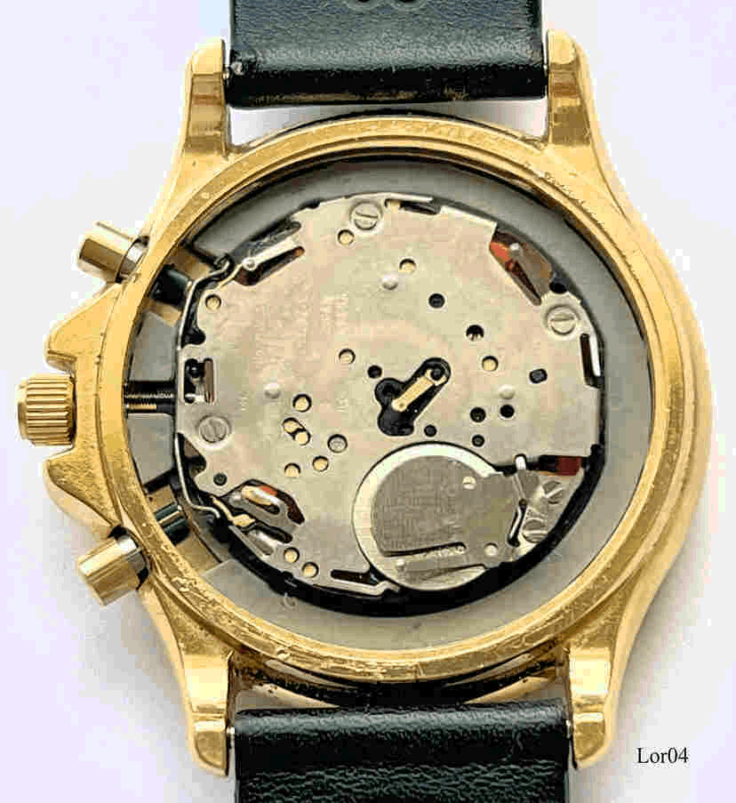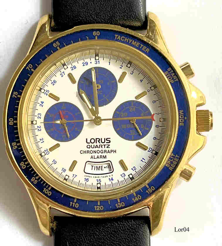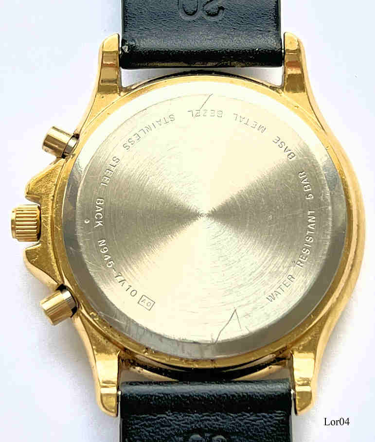Dies ist ein Lorus Quartz Chronograph vier Funktionen: Zeit, Alarm, Chrono, Timer. Beschriftung vorn:” LORUS, Quartz, Chronograph, Alarm”, hinten:” Water resistant, 5 Bar, Base Metal Bezel, Stainless Steel Back, N945-7A10 AO“ Base Metal Gehäuse mit Edelstahl Boden und schwarzem Lederarmband. Kaliber Shiojiri N945A, Kalender über Zeigeranzeige am blauen Halbmond
