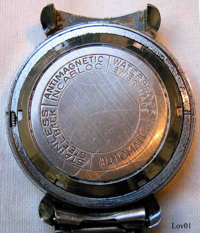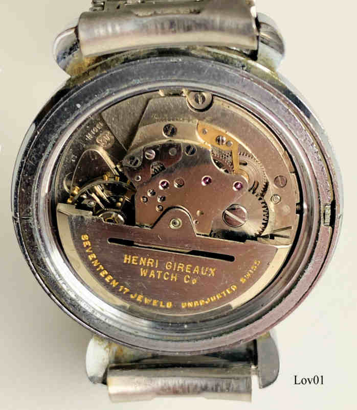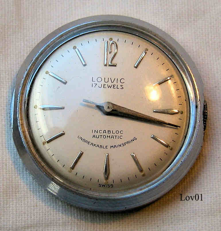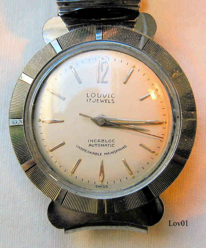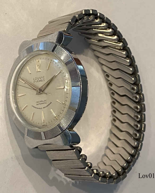 A Louvic Drivers Watch with AS Automatic movement Caliber1361N. Stainless Steel case with silver tone flex band. Signed front : ”Louvic 17 Jewels, Incablock, Automatic, Unbreakable Mainspring”, back: “Automatic, Stainless Steel Back, Antimagnetic, Incabloc, Waterproof, Swiss Made”, inside: “Henri Gireaux Watch Co.,Seventeen 17 Jewels, Unadjusted, Swiss, AS 1361 N”. Is called Drivers Watch, because one can mount the inner watch in any angel to the band, so one don’t need to take the hand from the wheel during driving, to see the time. Watch with hidden crown is independent from the outer case.