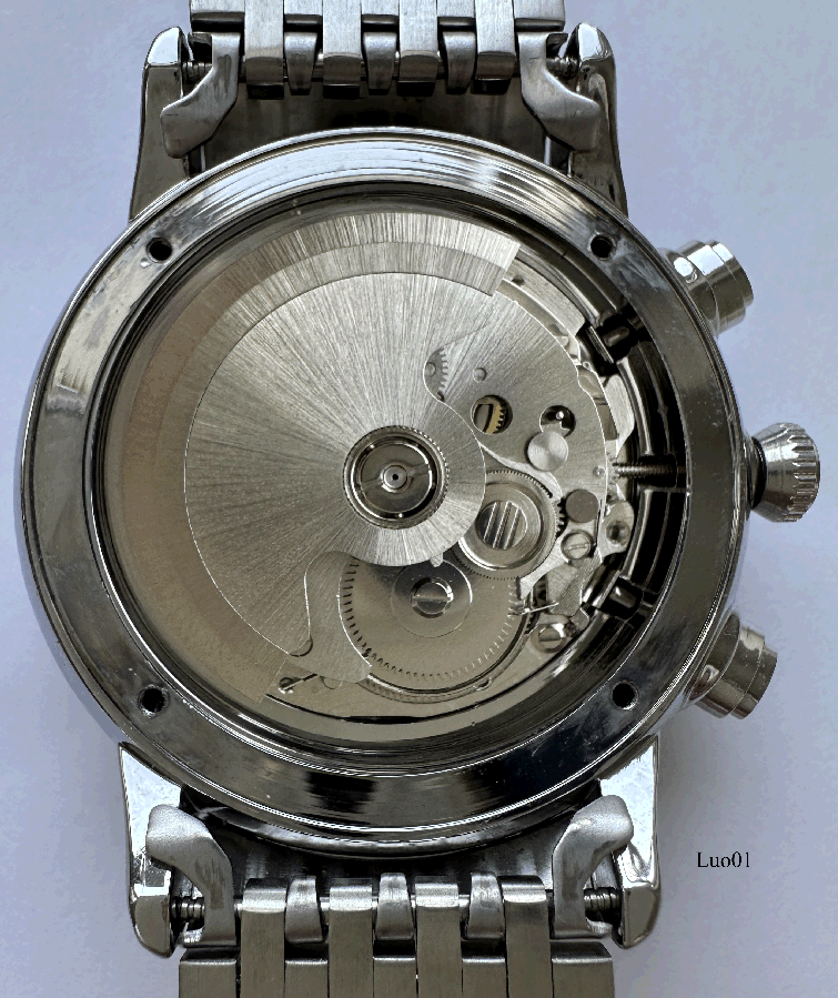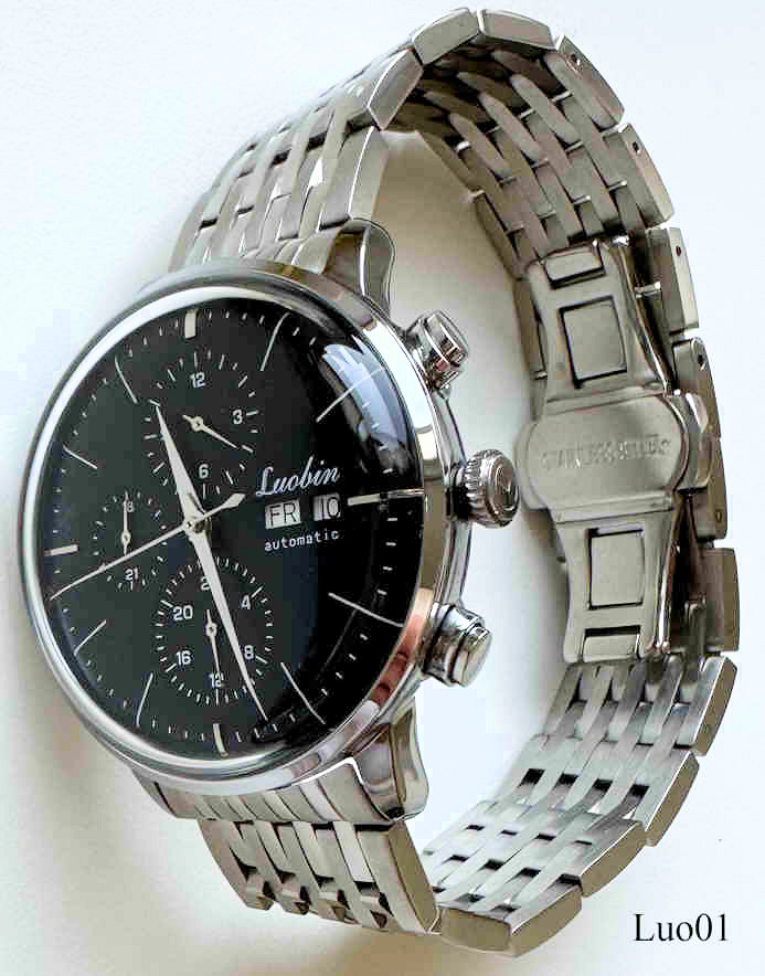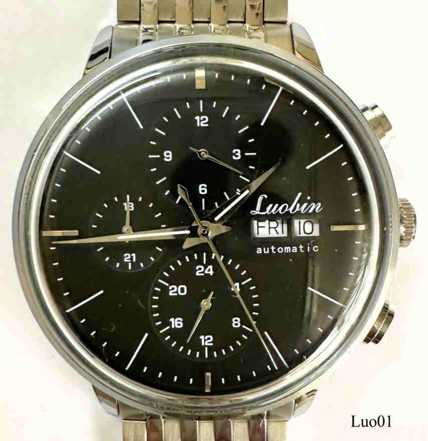 This automatic chronograph of Luobin has a glasbottom, an automatic movement and a very nice black dial. Day / Date calendar at 3, big stainless steel case. Signed front: “Luobin, Automatic”, back: ” ”, on the automatic weight: “ ”. Stainless steel band with butterfly clasp.