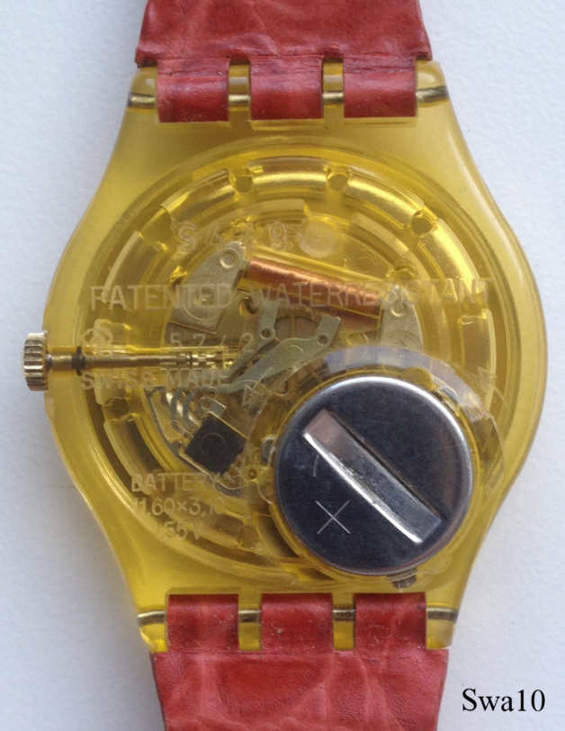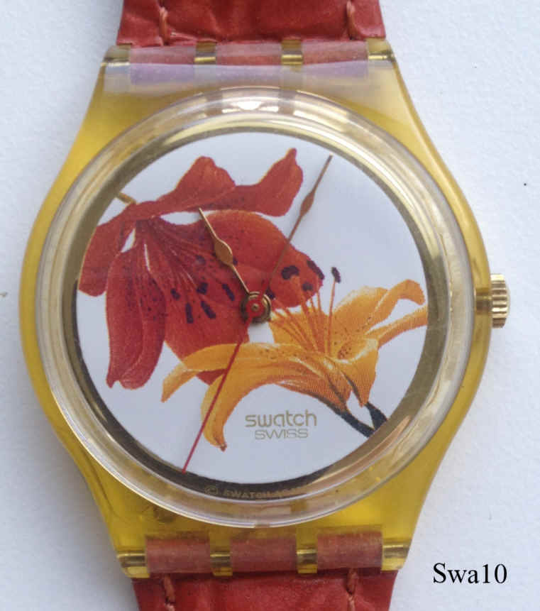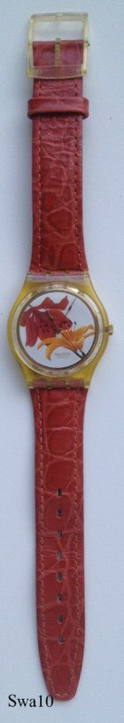 Eine Swatch Quartz Uhr, Modell Lylium, mit Kunststoff Gehäuse und durchscheinender Rückwand. Beschriftet vorn: “Swatch, Swiss, C Swatch AG 1994”, hinten: ”S449, Patented Water Resistant, 5742, Swiss Made, Battery, 11,60x3,10, 1,55 V”. Rotes Leder Armband.
