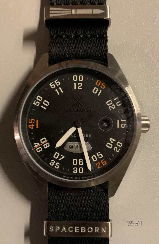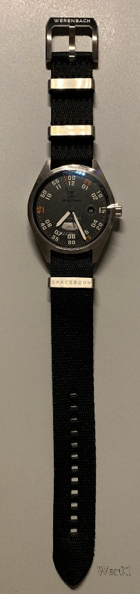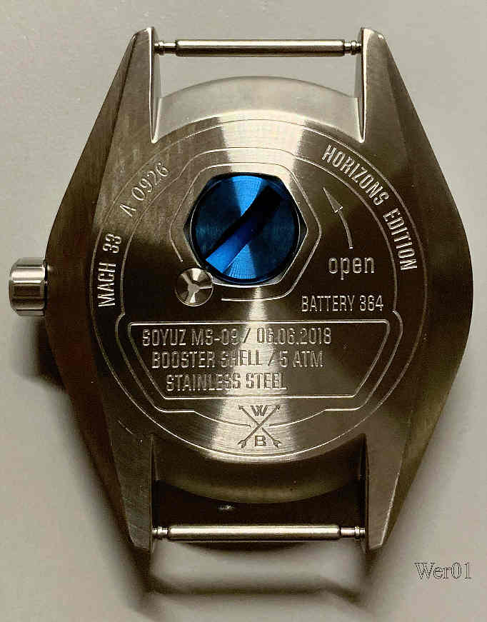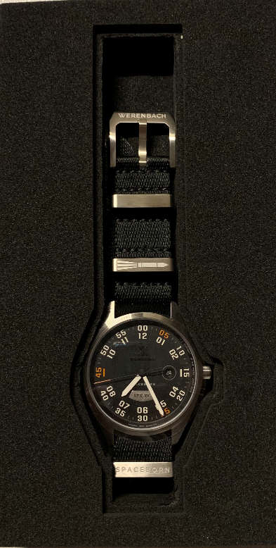 Eine Werenbach Quartzuhr aus der Kollektion Mach33, Modell Sport B42. Das Plättchen über der 6 ist echtes Raketenmaterial von der Sojus MS-09 mit der “Astro-Alex” Alexander Gerst am 06.06.2018 zur ISS geflogen ist, wo er als erster deutscher Astronaut das Kommando über die ISS übernahm. Das Stück stammt aus der Boosterverkleidung der Rakete und wurde in Kasachstan bei Baikonur abgeworfen. Beschriftung vorn: “Werenbach, Spaceborn, Soyuz Mat., Made on Earth” hinten: “Mach 33, A0926, Horizons Edition, Soyuz MS-09/06.06.2018, Booster Shell/ 5 ATM, Stainless Steel, Werenbach Logo”. Werk Miyota GM10, Datum bei der 3. Monocoque Gehäuse, vollständig geschlossen, Zugang nur über das Glas. Die Uhr enthält einen RFC Chip mit dem man über eine IOS oder Android App direkten Zugang zum Lifestream der ISS erhält. Damit kann man in Echtzeit miterleben, was die Außenkamera der ISS sieht. Mach 33 ist die Fluchtgeschwindigkeit um die Erde ins Weltall zu verlassen.
