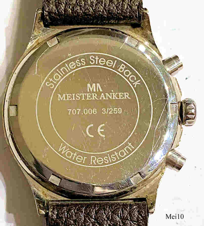Ein Damen Chronograph mit einem doppelten Schmuckstein Rand der Marke Meister-Anker mit Quartzwerk. Das Gehäuse ist aus Base Metal. Beschriftung vorn: “MA, Meister Anker, Chronograph”, innen: ”SIIO, No Jewels, Japan, VD54B”, hinten: “Stainless Steel Back, Water Resistant, MA, Meister Anker, 707.006, 3/259”. Uhrwerk Kaliber SIIO VD54B.