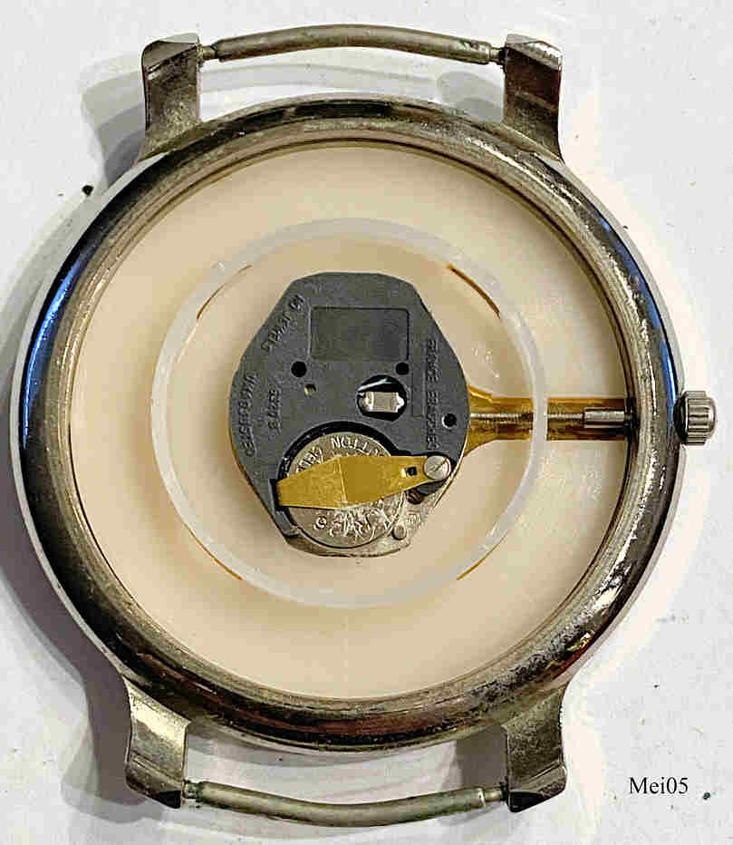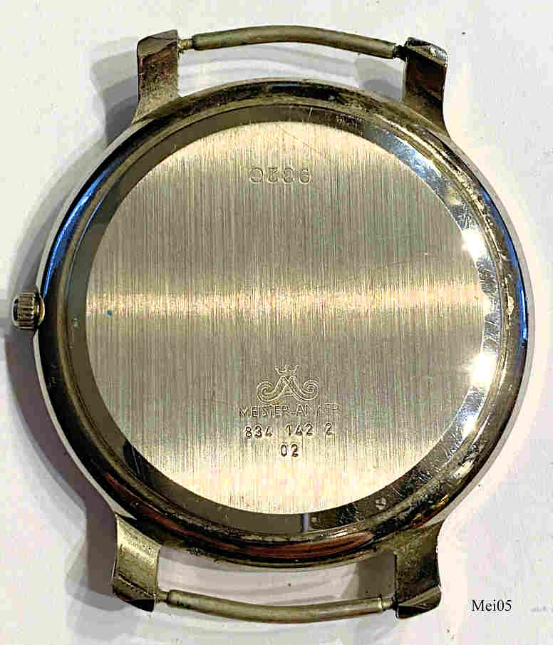 Eine einfache Schmuckuhr der Marke Meister-Anker mit Quartzwerk. Das Gehäuse ist aus Base Metal. Beschriftung vorn: “Design, Germany”, innen: ”France Ebauche, 6320B, No Jewels, Unadjusted”, hinten: “834 142 2, 02, 9386”. Uhrwerk Kaliber France Ebauche 6320B.