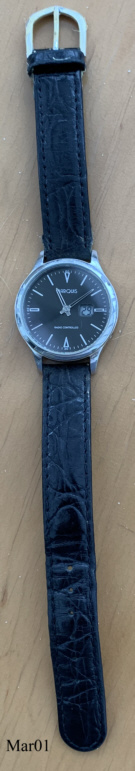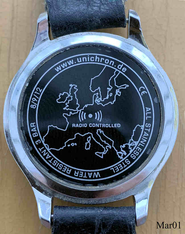 Dies ist eine Marquis Funkuhr mit Junghans Werk, die in 2012 bei ALDI verkauft wurde. Beschriftet vorn: ”Marquis, Radio Controlled.”, innen: ”Germany, No Jewels, 42-05b”, hinten: “www.unichron.de, CE, All Stainless Steel, Water Resistant 3 ATM 3 Bar, 8/9/12, Radio Controlled”, Edelstahl Gehäuse, Schwarzes Lederarmband.