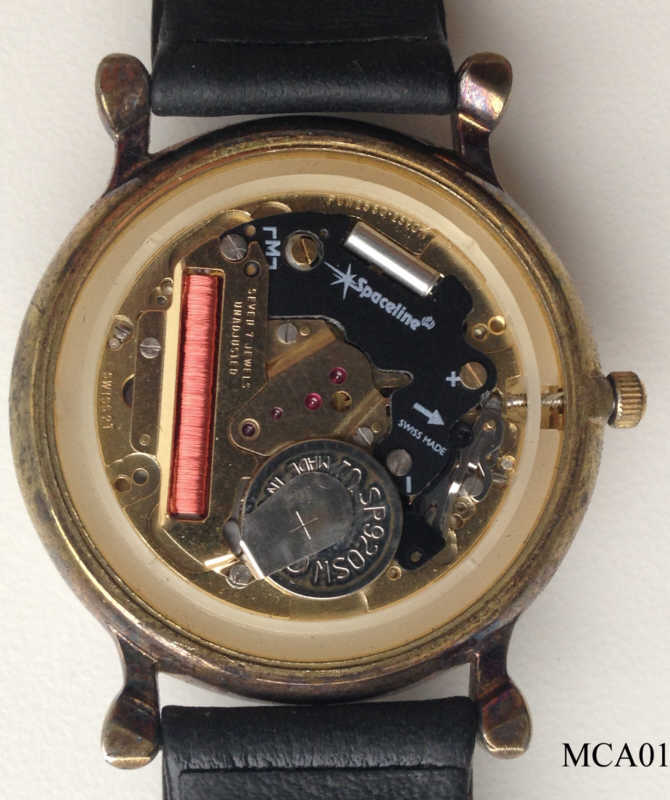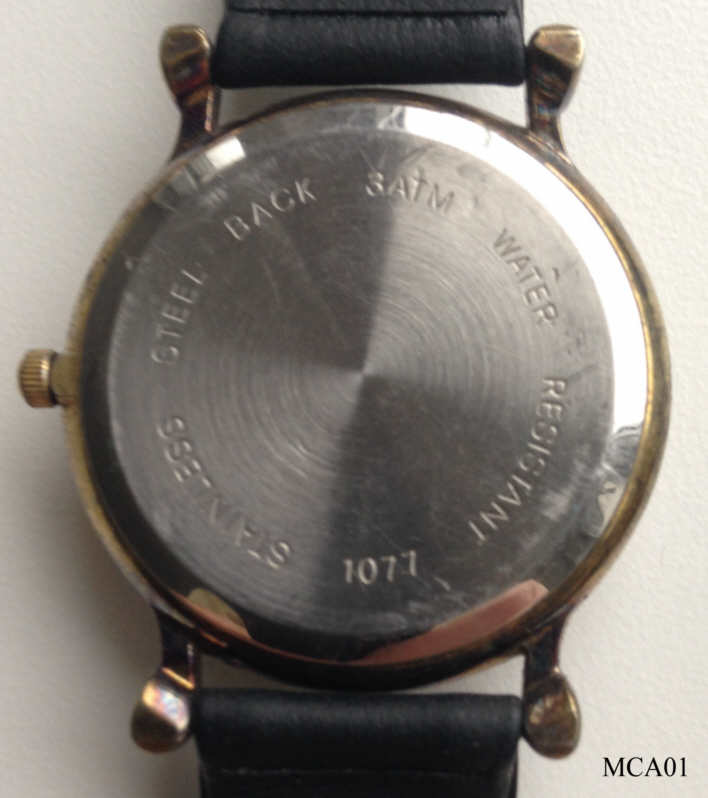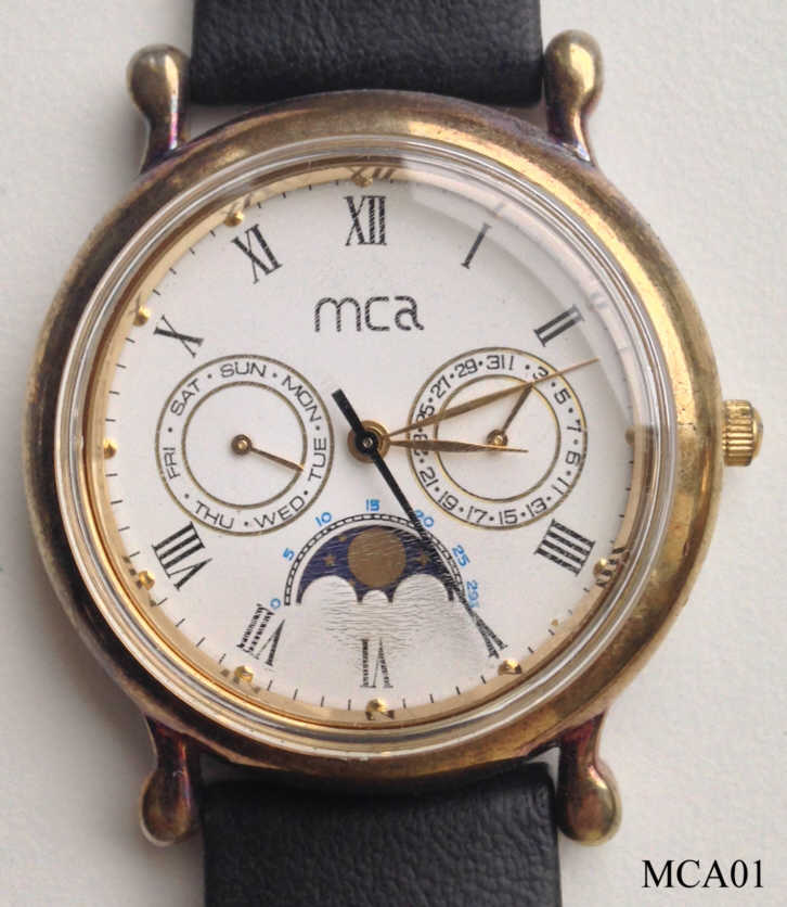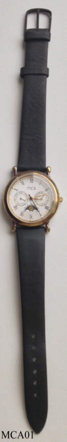 Eine MCA Quartz Uhr im Chronographen Look. Die “Augen” zeigen bei der 3 das Datum, bei der 6 die Mondphase und bei der 9 den Monat. Werk PUW 2550. Beschriftet vorn: “MCA”, hinten: ”Stainless Steel Back, 3 ATM Water Resistant, 1077”, innen: “Seven 7 Jewels, Unadjusted, SW392T, PUW 2550-2590N ”. Schwarzes Lederarmband.