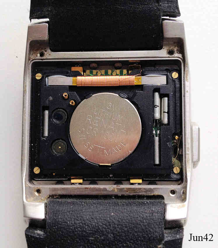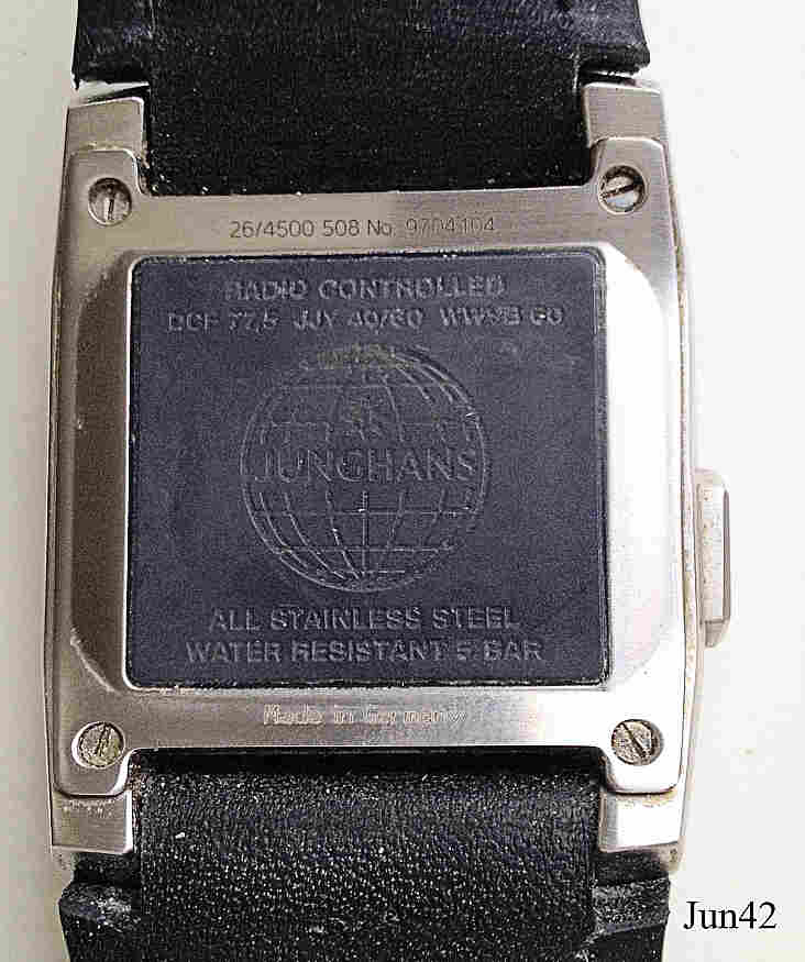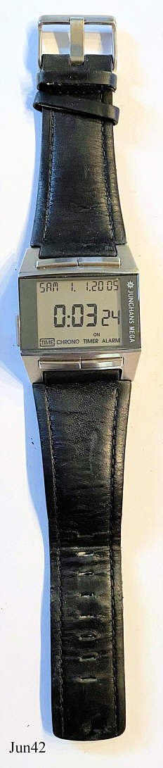 Eine Junghans Mega 1000 Funkuhr mit Digitalanzeige, Funksteuerung über alle regionalen Quellen: DCF77, WWVB (USA), JJY40 (Japan), JJY60 (Japan,China, Korea und Taiwan). Edelstahl Gehäuse und schwarze Kunststoff Rückwand. Beschriftet: ”Junghans Mega ”, hinten: “26/4500 508 No.: 9704104, Radio Controlled, DCF 77,5 JJY40/60 WWVB 60, Junghans, All Stainless Steel, Water Resistant 5 Bar, Made in Germany”, Funktionen: Zeit, Chrono, Timer, Alarm, schwarzes Lederband