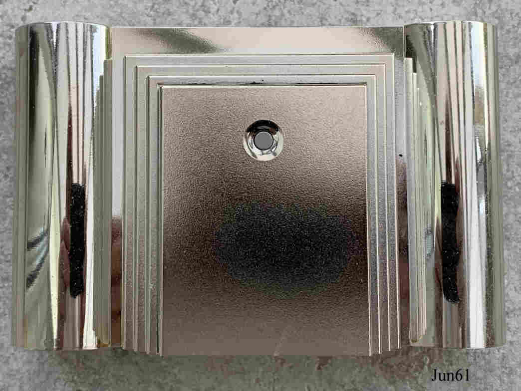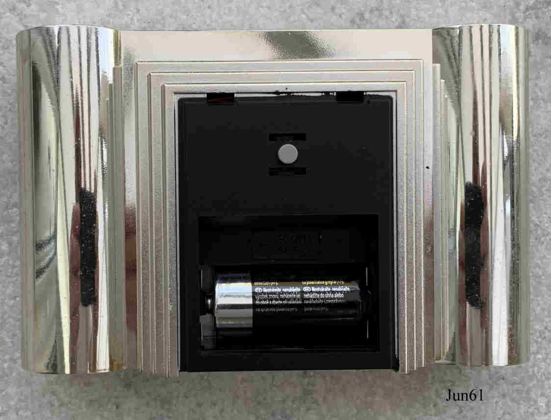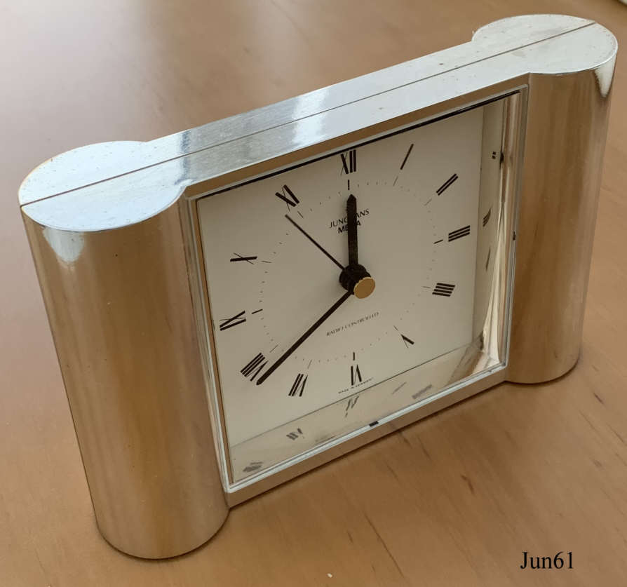 Eine Junghans Mega Tisch Funkuhr mit weißem Zifferblatt, schwarzen Zeigern und römischen Ziffern. Verchromtes Kunststoff- Gehäuse. Beschriftet vorn: ”Junghans, Mega, Radio Controlled” hinten: “ ”, in der hinteren Klappe: “Junghans, Mega, 384/6210.00, DCF 01211”.