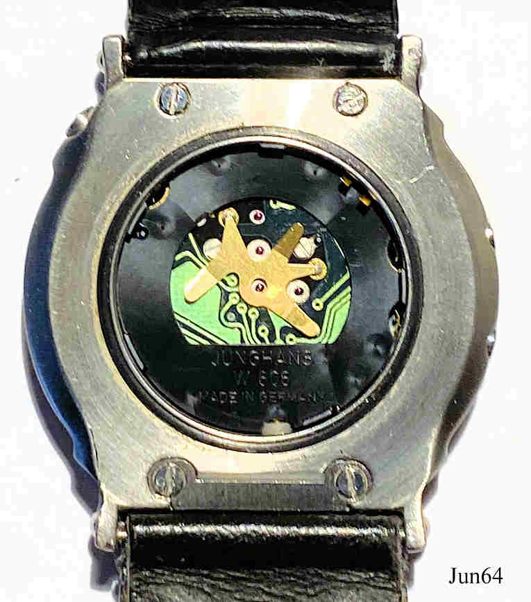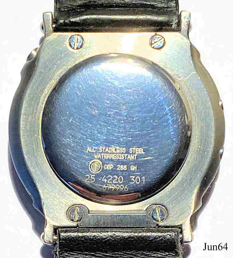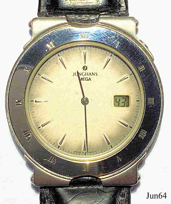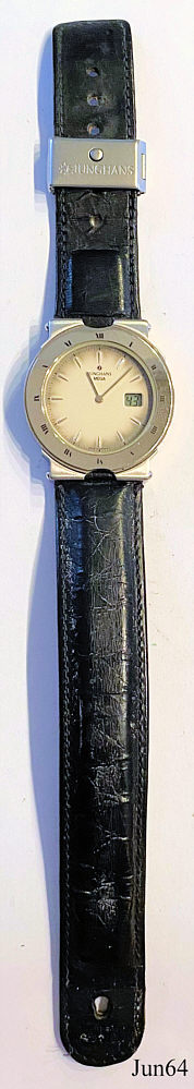 This is a Junghans Mega atomic watch with a stainless steel case, light grey dial and silver indices. The leatherband is black. Signed front: ”Junghans, Mega, Made in Germany”, back: ”All Stainless steel, Water Resistant, DBP 288 GH, 25 4220 301, 679996”