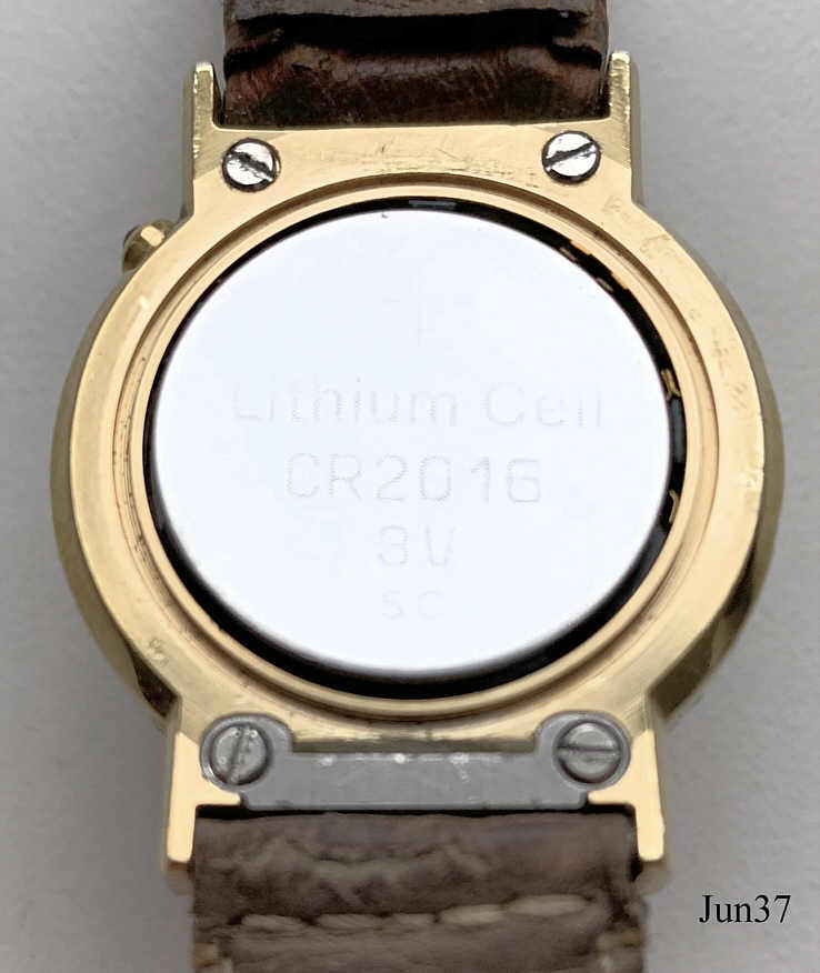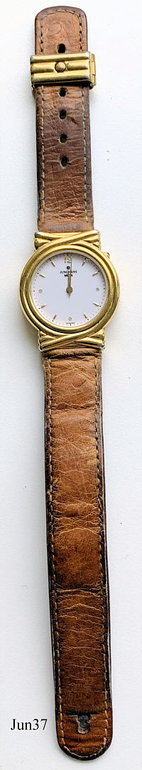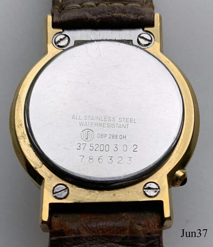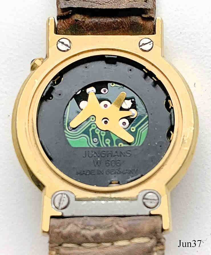Dies ist eine Junghans Mega Damen Funkuhr. Es ist die erste Analog Damen Funkuhr auf dem Markt. Sie hat ein Base Metal Gehäuse in goldfarben, mit weißem Zifferblatt und goldenen Stegen. Bei der drei , 6 und 9 sind Zirkone eingesetzt. Hinter dem Zirkon bei der 3 ist eine rote LED als Indikator eingebaut. Das Lederarmband mit integrierter Antenne ist braun. Beschriftet vorn: ”Junghans Mega”, hinten: ”All Stainless Steel, Waterresistant, DBP 288 GH, 37 5200 3 0 2, 786323”, innen: “Junghans, W606, Made in Germany”