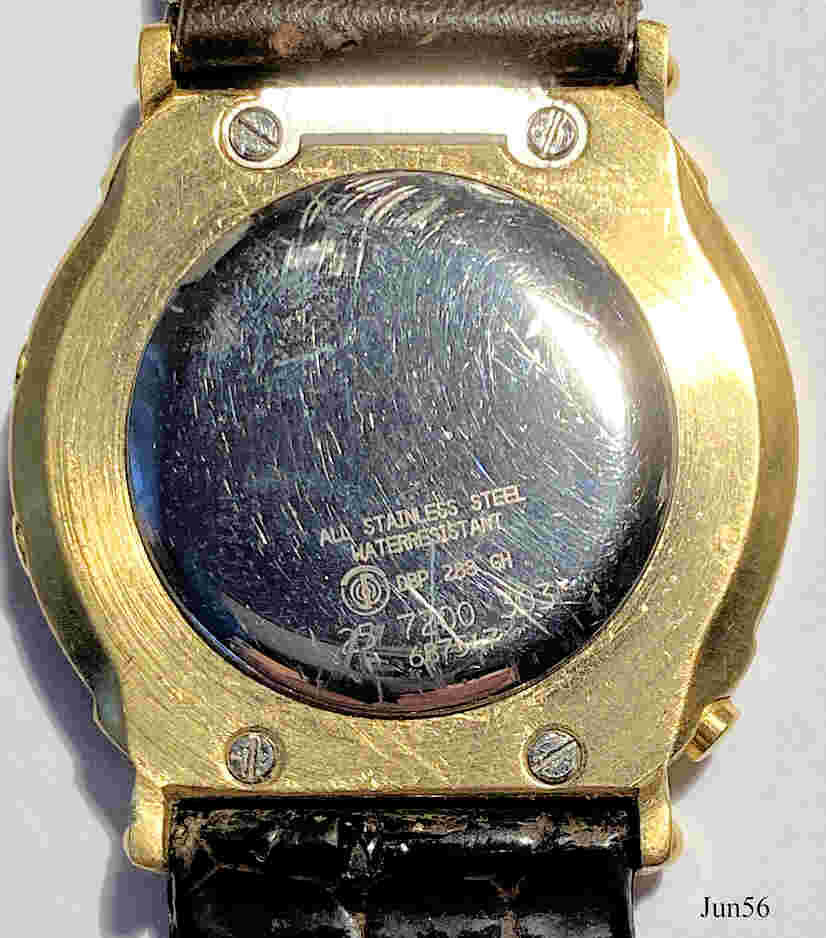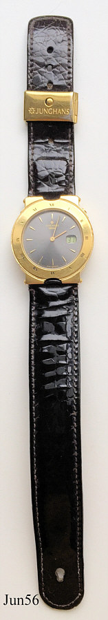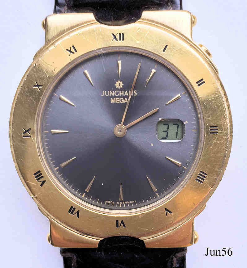 This is a Junghans Mega atomic watch with a stainless steel case, dark grey dial and gold indices. The leatherband is black. Signed front: ”Junghans, Mega, Made in Germany”, back: ”All Stainless steel, Water Resistant, DBP 288 GH, 25 7200 303, 687547”