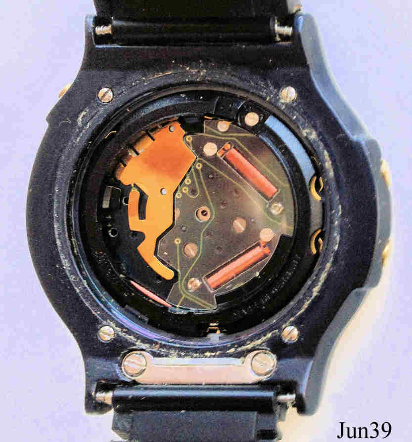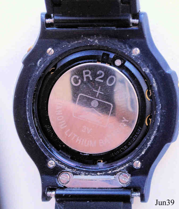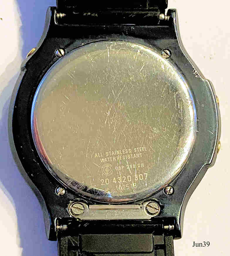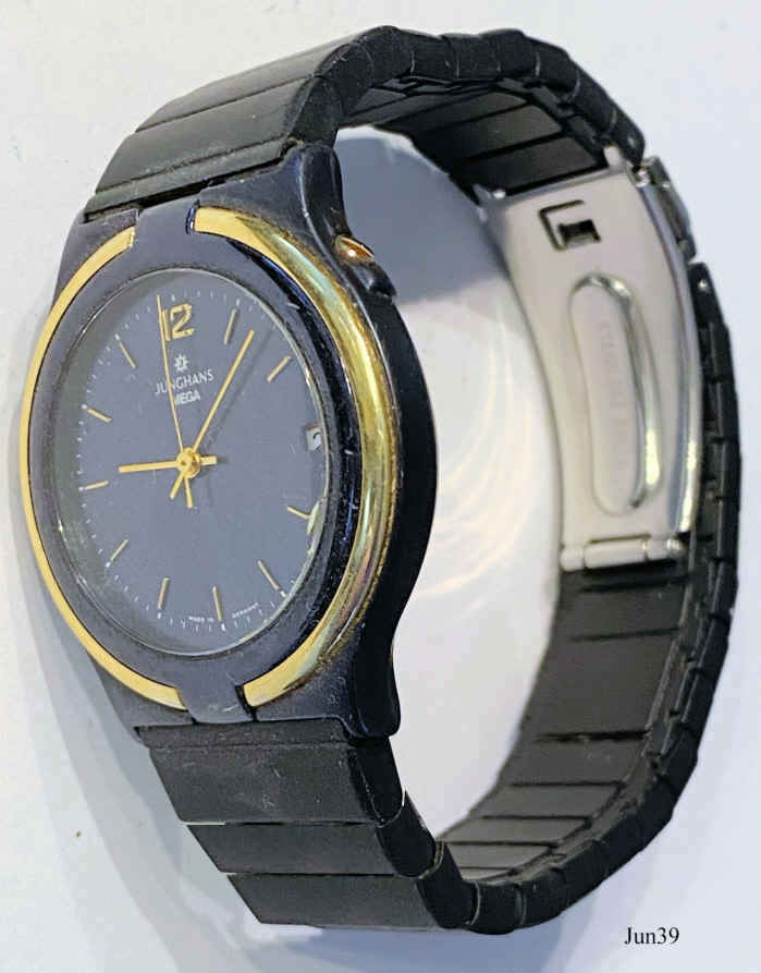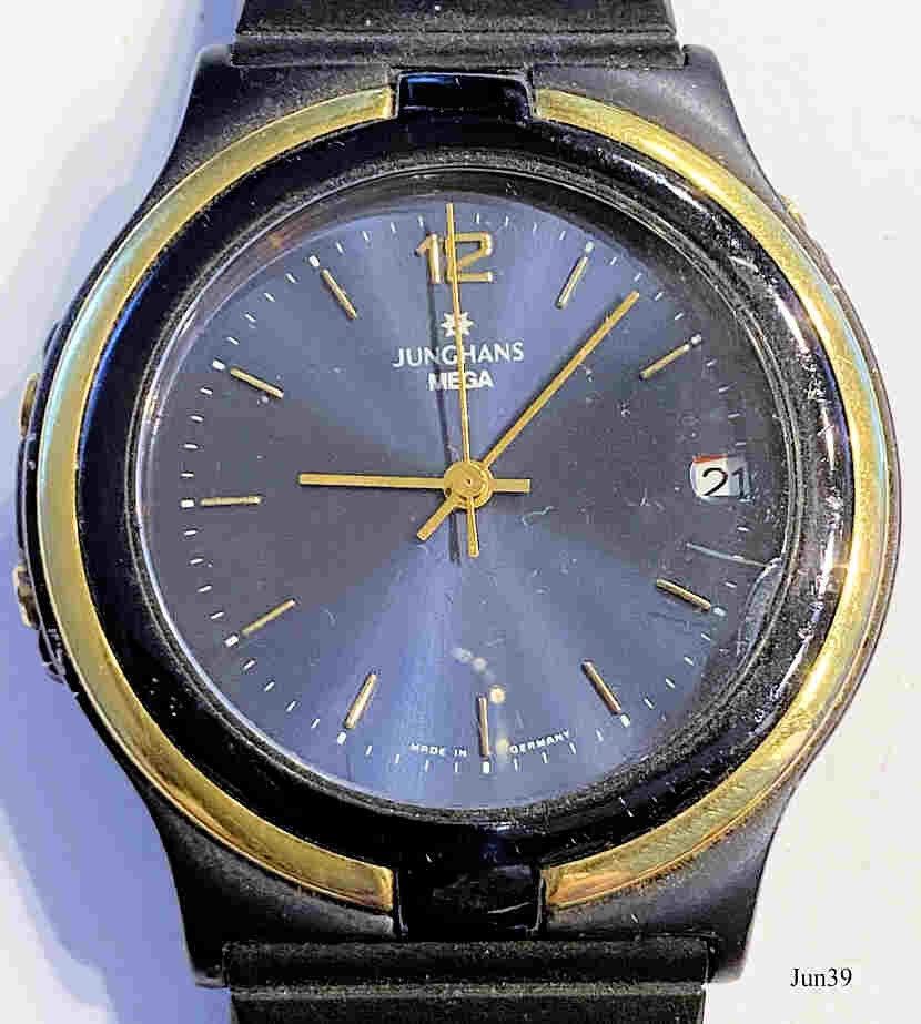Eine Junghans Mega Armbanduhr mit Kalender und Kunststoffgehäuse. Es ist eine normale Funkuhr, die die Signale der DCF77 Uhr empfängt und umsetzt. Inschrift vorn: ”Junghans, Mega, Made in Germany”, hinten: ”All Stainless Steel, Waterresistant, DBP 288 GH, 20 4320 307, 100518”. Schwarzes Kunststoffarmband. Im Gegensatz zu anderen Mega hat diese Uhr eine mechanische Datumsanzeige statt der Digitalanzeige.