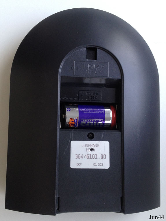 Eine Junghans Mega Tisch Funkuhr mit schwarzem Zifferblatt und gelben Zeigern und Ziffern. Schwarzes Kunststoff- Gehäuse und schwarze Kunststoff Rückwand. Beschriftet vorn: ”Junghans, Mega, Radio Controlled”, hinten: “IEC LR14, Size C, DBP288GH, Junghans Mega, 364 6101.00, DCF 01 302”