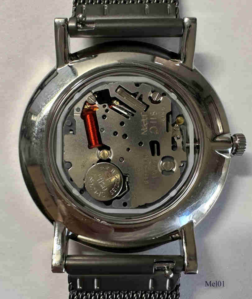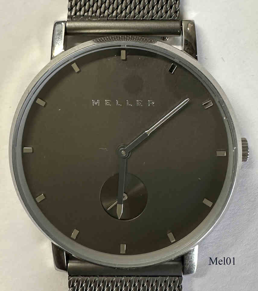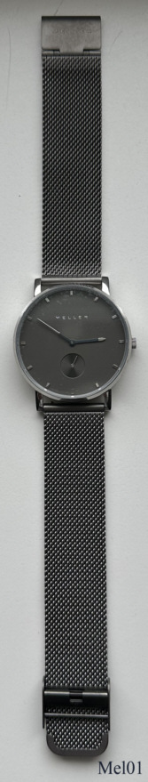 Eine Meller Herren Quartz Uhr mit dunkel grauem Zifferblatt. Sekundenzeiger bei der 6. Werk SIIO VD78A. Beschriftet vorn: “Meller”, hinten: ”All Stainless Steel, Water Resistant 5 ATM, Sapphire Crystal, Japan Movement, 20195, Meller”, innen: “SIIO, VD78A, Japan, No Jewels”. Graues Stahl Milanaise Armband.