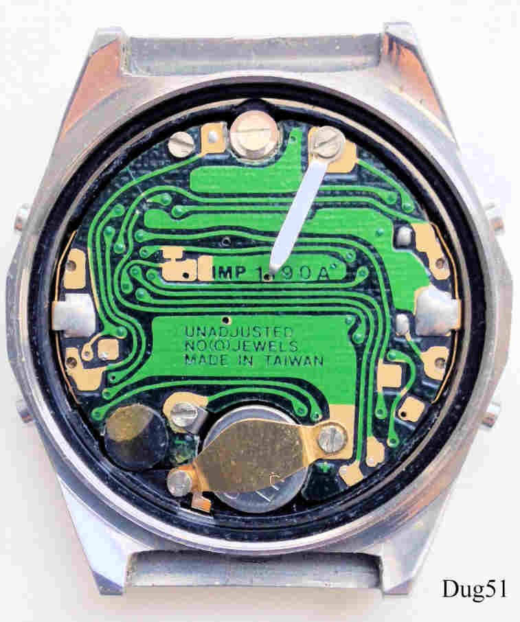 Ein Dugena LCD Alarm Chronograph mit Edelstahl Gehäuse und Edelstahlboden. Beschriftung vorn: “Dugena, Melodia-Quartz”, hinten: ”889260, 193, Antichoc, Water Resistant, Stainless Steel”, innen: “IMP, 1190A, Unadjusted, No Jewels, Made in Taiwan”. Alle Anzeigen erfolgen auf einem LCD Display.