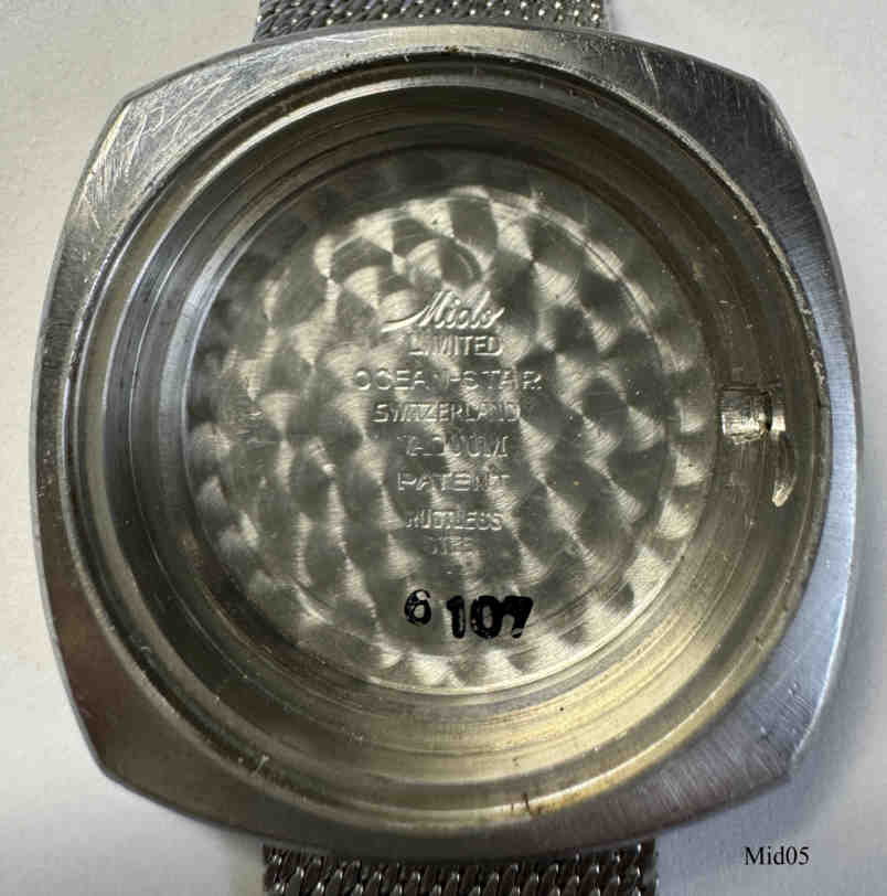 This is a Mido Ocean Star DatoDay Chronometer, Mido Caliber 1147 OCD (As 1831?), Stainless Steel case, Day/Date at 3. Signed front: ”Mido, Ocean Star, Datoday, Chronometer, Swiss Made”, back: ”6435903, Stainless Steel, Swiss Made, 5519”, inside: ”Mido, Swiss Limited, Cal. 1147 OCD, 19800, Adjusted to six (6) Positions + Temperature, Seventeen 17 Jewels”, Milanaise band with Mido clasp.
