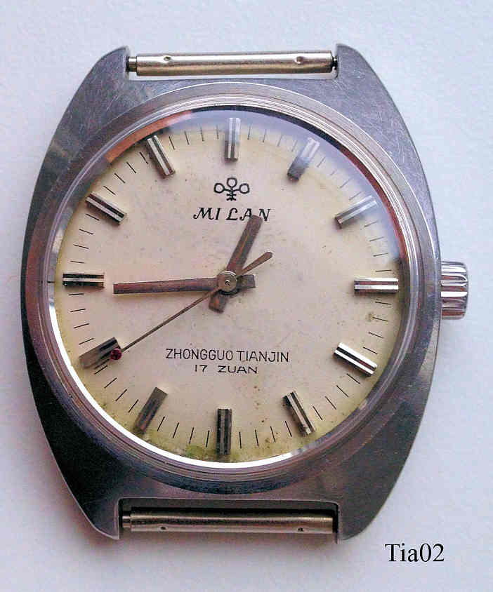 Eine Tianjin Milan Handaufzugs Uhr aus dem größten Chinesischen Uhrenwerk Tianjin, 17 Steine. Beschriftet vorn: “Mi Lan, Zhongguo Tianjin, 17 Zuan”, hinten: Logo, innen: “ZTZA”. Edelstahl Gehäuse, verschraubter Edelstahl Boden, Kaliber ZTZA.