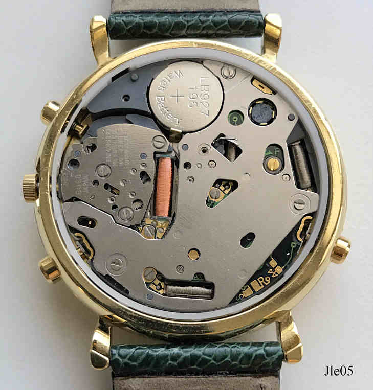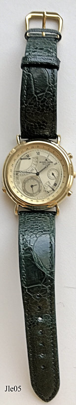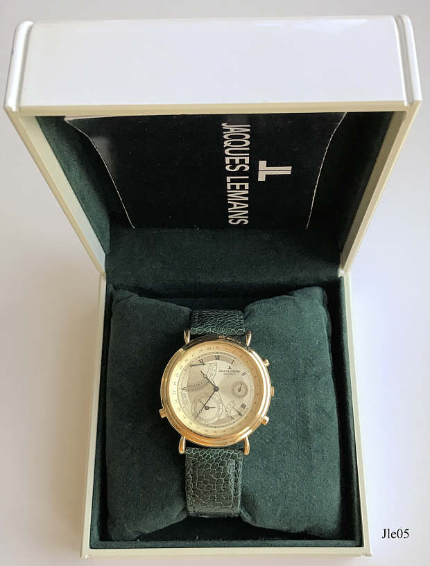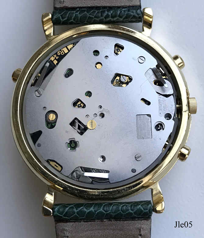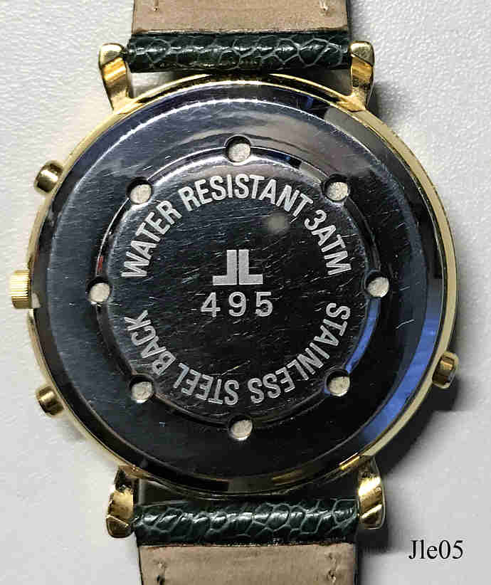 A Jacques Lemans Minute Repeater with goldtone dial and stainless steel case. Shows the time with the main hands and the chime function on the dial at 7. Date by the slim main hand, day at 11, month at 7, GMT display at 5. Signed front: “Jacques Lemans, Quartz”, back: “Stainless Steel Back, Water Resistant 3 ATM, JL495”, inside: “6U60, Japan, Pat.4185283, Miyota Co., No Jewels, unadjusted”. Werk Miyota 6U60.