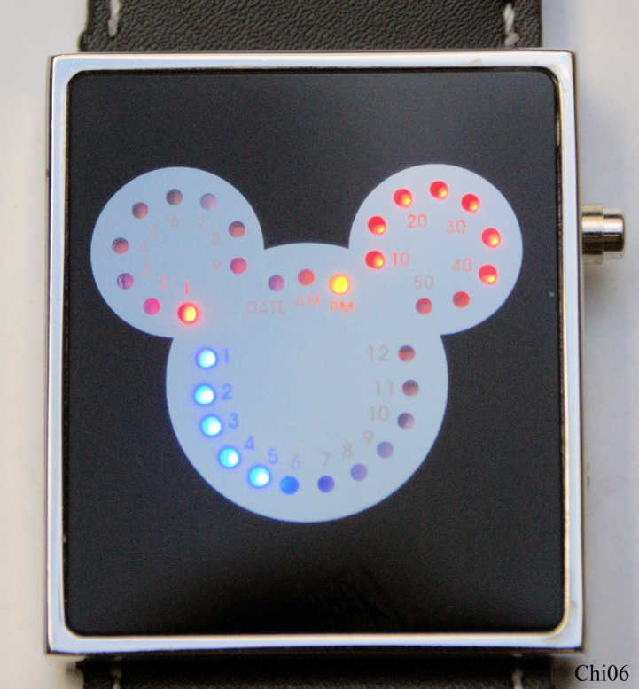 Dies ist eine ungewöhnliche LED Uhr aus China, bei der das Display viel Ähnlichkeit mit der Silhouette von Mickey Mouse hat. Sie zeigt Datum und Zeit an. Drei gelbe LEDs in der Mitte zeigen : Date, AM, PM. Die blauen LEDs zeigen die Stunde oder den Monat, die roten LEDs zeigen links die 1 Minuten oder Tage und rechts jeweils die10 Minuten . Im linken Bild ist es also: PM, 5 Stunden, 1 Minute und 40 Minuten, also 17:41 Uhr. Im rechten Bild: Date, 5 Monat und 5 Tag, also 05.Mai, die Jahreszahl wird nicht angezeigt. Keine Beschriftung