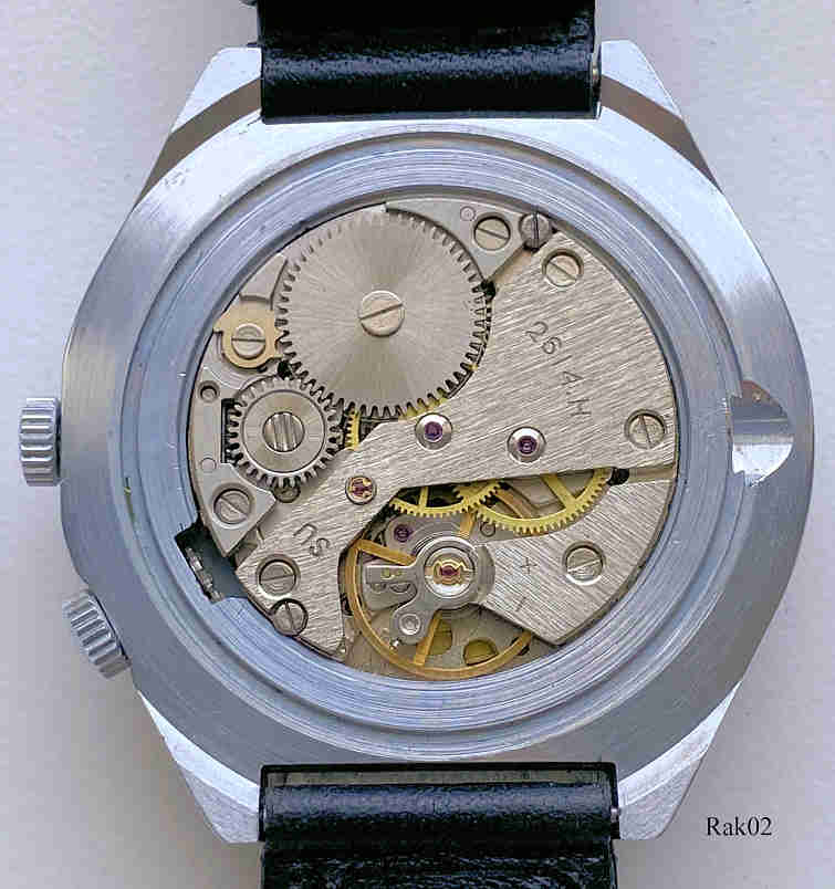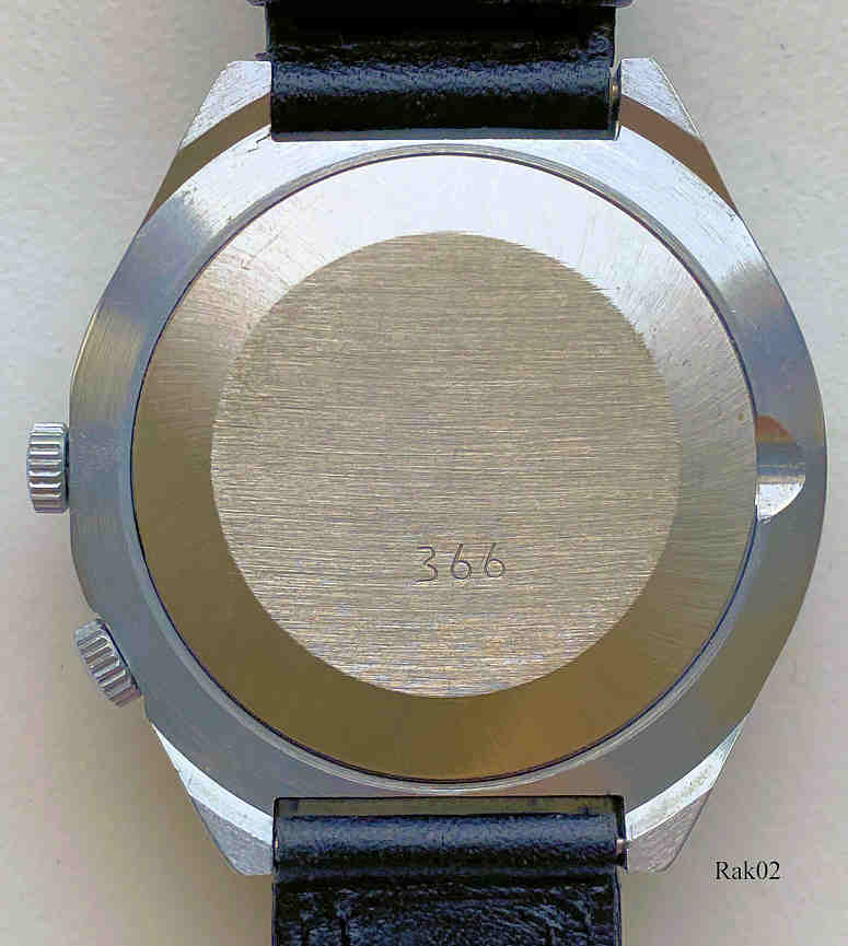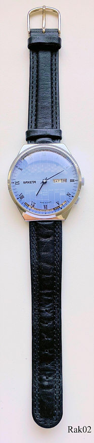 Dies ist eine Raketa Kalenderuhr, Caliber 2614. Beschriftung vorn: ”Raketa, Made in USSR”, Rückseite: ”366”, Bei der “6” ist die Jahreszahl auf den entsprechenden Monat einzustellen, entsprechend zeigt dann bei der “12” der Wochentag auf das jeweilige Datum. Edelstahl Gehäuse, gedrückter Boden, schwarzes Lederarmband.