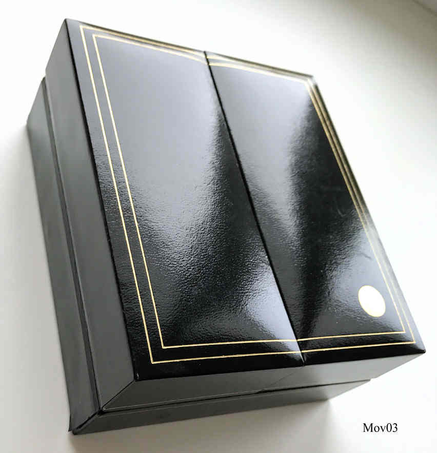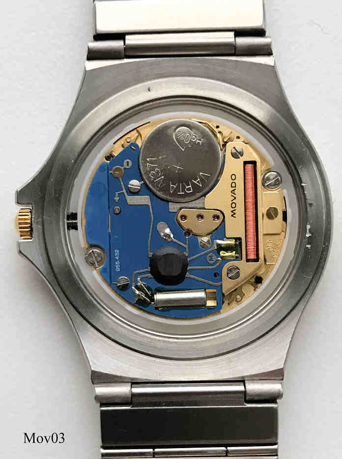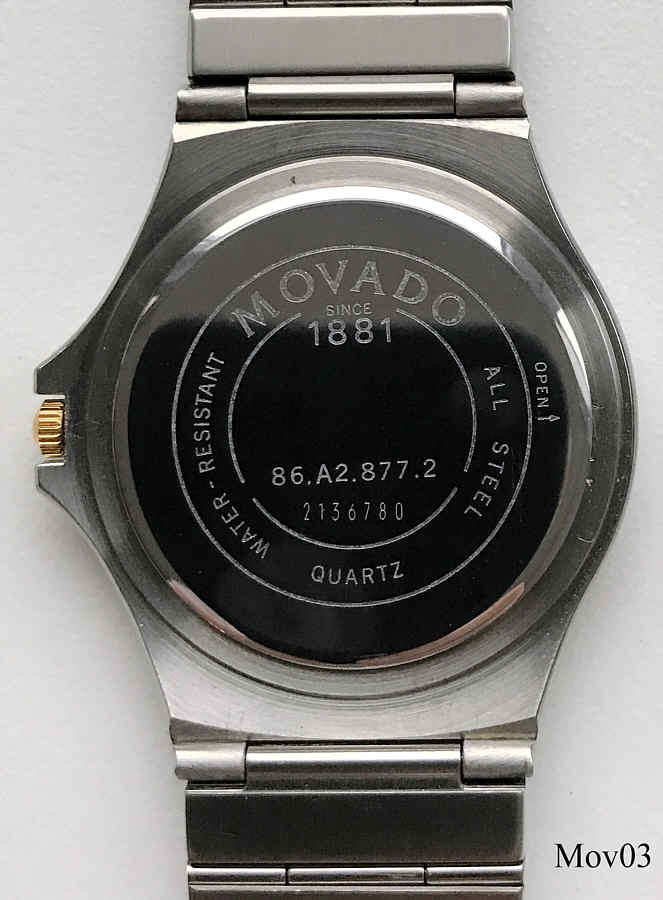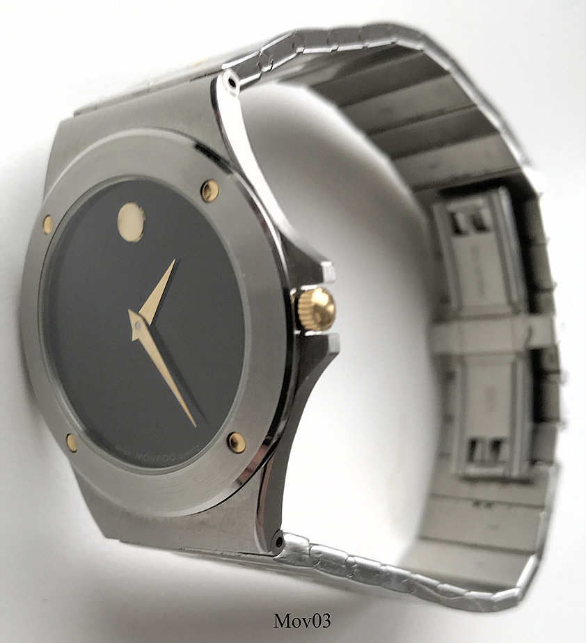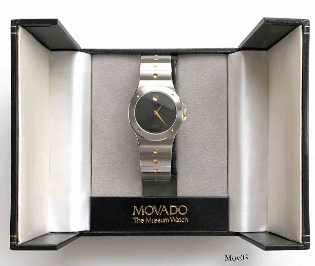 Das klassische Desig der Movado Museumsuhr wurde 1947 vom Americanischen Künstler Nathan George Horwitt entwickelt. Das Motto war: Ein schwarzes Zifferblatt mit einem solitären goldenen Punkt bei der 12, der die Sonne am Mittag symbolisiert. Die Zeiger stehen für die Bewegung der Erde. Beschriftet vorn: “Swiss Movado Quartz”, hinten: “Movado since 1881, All Steel, Quartz, Water Resistant, 86-A2-877.2, 2136780”, innen: “ ETA 955.432, 7 Jewels, Movado “, Edelstahl Gliederarmband mit vergoldeten Punkten.