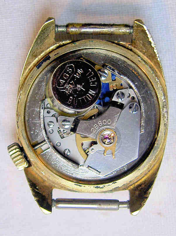 Dies ist eine Nepro Damen electric, sie verwendet das Werk PUW3000. Die Unruhe schwingt hier mit der Geschwindigkeit von 28800 Halbschwingungen pro Stunde, d.h. 8 Halbschwingungen pro Sekunde. Die Uhr hat ein sehr ansprechendes vergoldetes Gehäuse, die Krone ist bei der 4. Beschriftet: ”NEPRO, electric” hinten: ”Base Metal Bezel, Stainless Steel Back, Waterproof, 1143, Eveready,1,35V, 323” Kaliber: PUW3000.