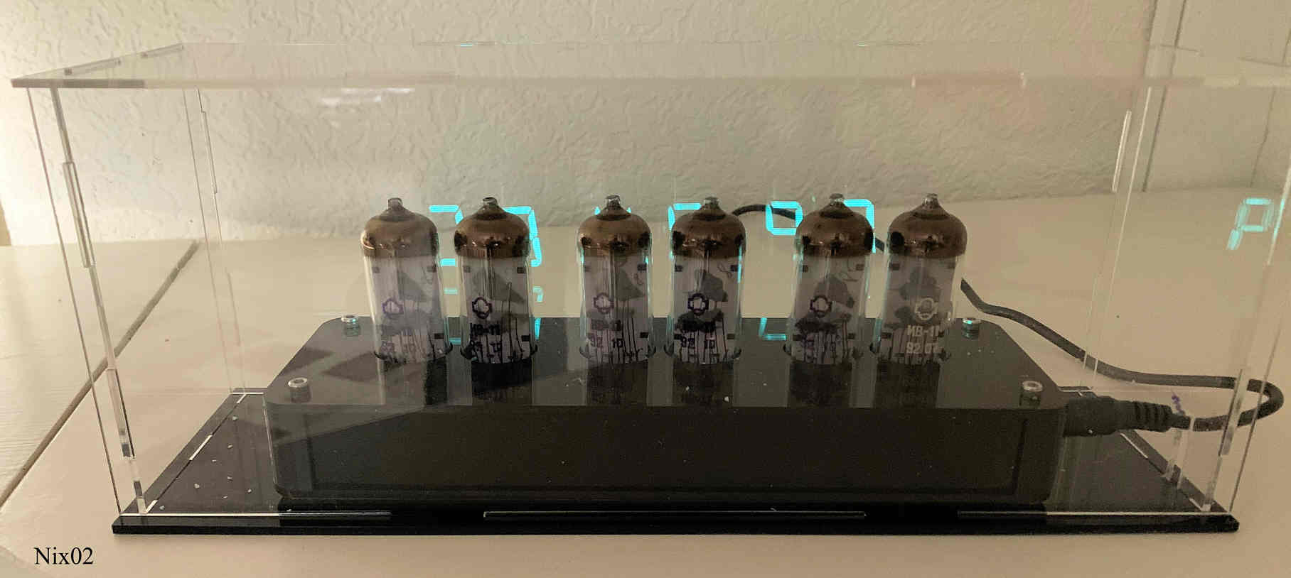 Eine Nixie Digitaluhr aus China. Diese Uhr wird als Bausatz oder als Fertigmodell vertrieben. Sie zeigt abwechselnd die Zeit, das Datum und die Temperatur an und kann per Fernsteuerung umgeschaltet werden. Außerdem haben die Nixie Röhren eine LED Beleuchtung von unten mit wechselnden Farben |