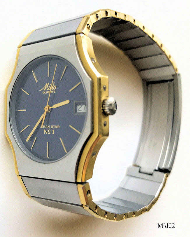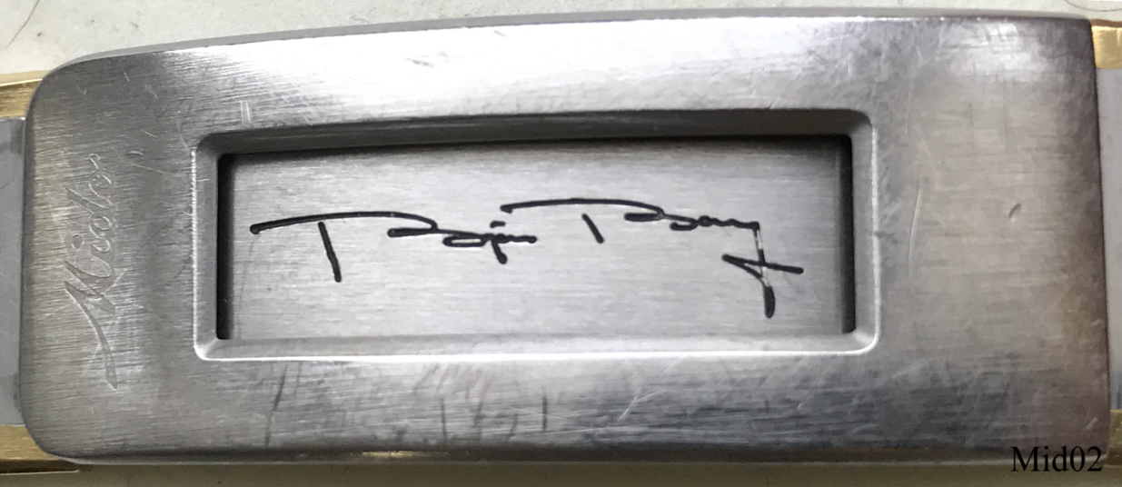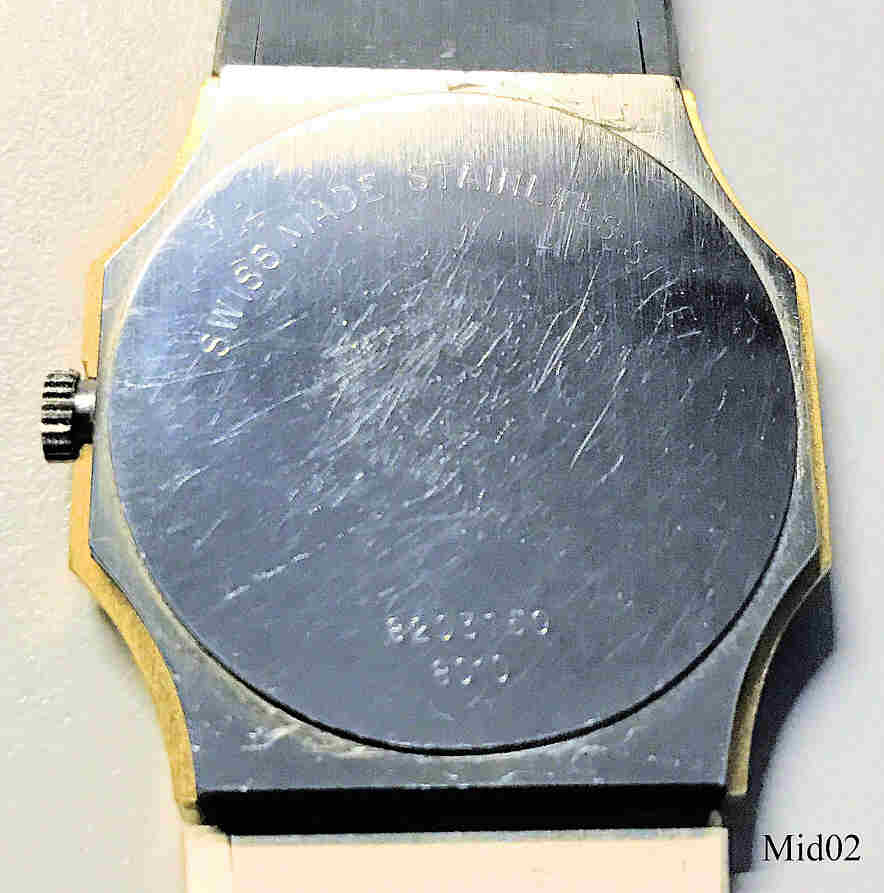 Dies ist eine Mido Ocean Star No.1 Uhr, Kaliber 8010, ETA 955.111, Stahl / Gold Gehäuse, gepresster Edelstahlboden, Kalender bei der 3. Beschriftet vorn: ”Mido, Quartz, Ocean Star, No. 1, Swiss ”, hinten: ”Swiss Made, Stainless Steel, 8203150, 8010”, innen: ”Mido, ETA 955.111”, Stahl / Gold Gliederarmband mit unterschriebener Schließe. Auf der Schließe das Autogramm von Björn Borg, Wimbledon Sieger von 1980 gegen McEnroe und seitdem Markenbotschafter von MIDO