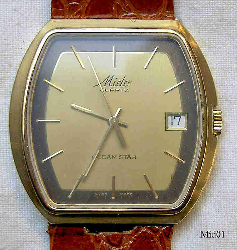 Dies ist eine Mido Ocean Star Quartz Uhr, Kaliber 8902-1, ESA 955.111, TV ähnliches base metal Gehäuse, gepresster Edelstahlboden. Beschriftet vorn: ”Mido, Quartz, Ocean Star”, hinten: ”Mido, Ocean Star, Aquadura, 8746302, 8902-1”, innen: ”Mido, 955.111”