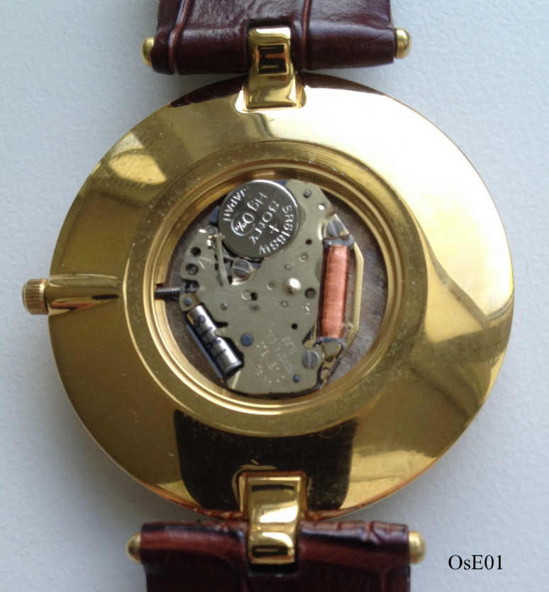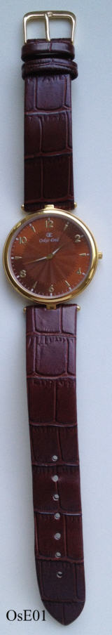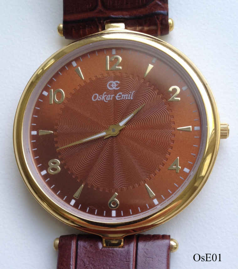 Eine Quartz Uhr der Marke Oskar Emil, Modell Vienna red, mit rotem Zifferblatt. Base Metal Gehäuse und Stainless Steel Back. Beschriftung vorn: ”Oskar Emil”, hinten: ”All Stainless Steel, Gold Plated, 3 ATM Water Resistant, Oskar Emil, Vienna-G, Serial Nr.: 825, Quartz Movement”, innen: “Japan, No 0 Jewels, Miyota Co., 1L22”, Braunes Lederarmband. Werk Miyota Kaliber 1L22