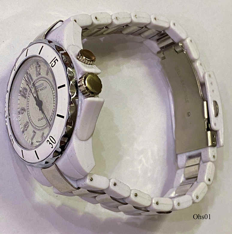 Eine Quartz Uhr aus China mit Kunststoff Gehäuse und Stainless Steel Back. Beschriftung vorn: ”Ohsen, Sportwatch, Quartz, Water Resist”, Rückseite: ”Stainless Steel Back, Water Resistant 3ATM, Ohsen, FG0786”, Weißes Kunststoff Gliederarmband. Die Uhr hat transparente Ziffern, durch Druck auf den Knopf bei der 2 werden die Ziffern von innen farbig beleuchtet. Elektronic J-129A-C