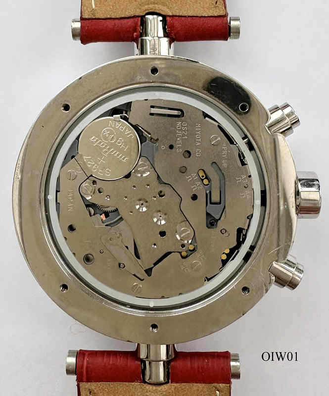 Ein O.I.W. Chronograph mit Base Metal Gehäuse und verschraubtem Base Metal Back, ein Quartz Chronograph mit Miyota OS21 Werk. Beschriftet vorn: ”O.I.W.”, hinten: “Officine Italiane Wrist Watch, O.I.W., I live....and you?, 0246C, Subproof 5ATM”. Innen läuft ein Quartzwerk der Firma Miyota, KaliberOS21. Verschraubte Krone, gelblichesLederarmband. Datum bei der “6”.