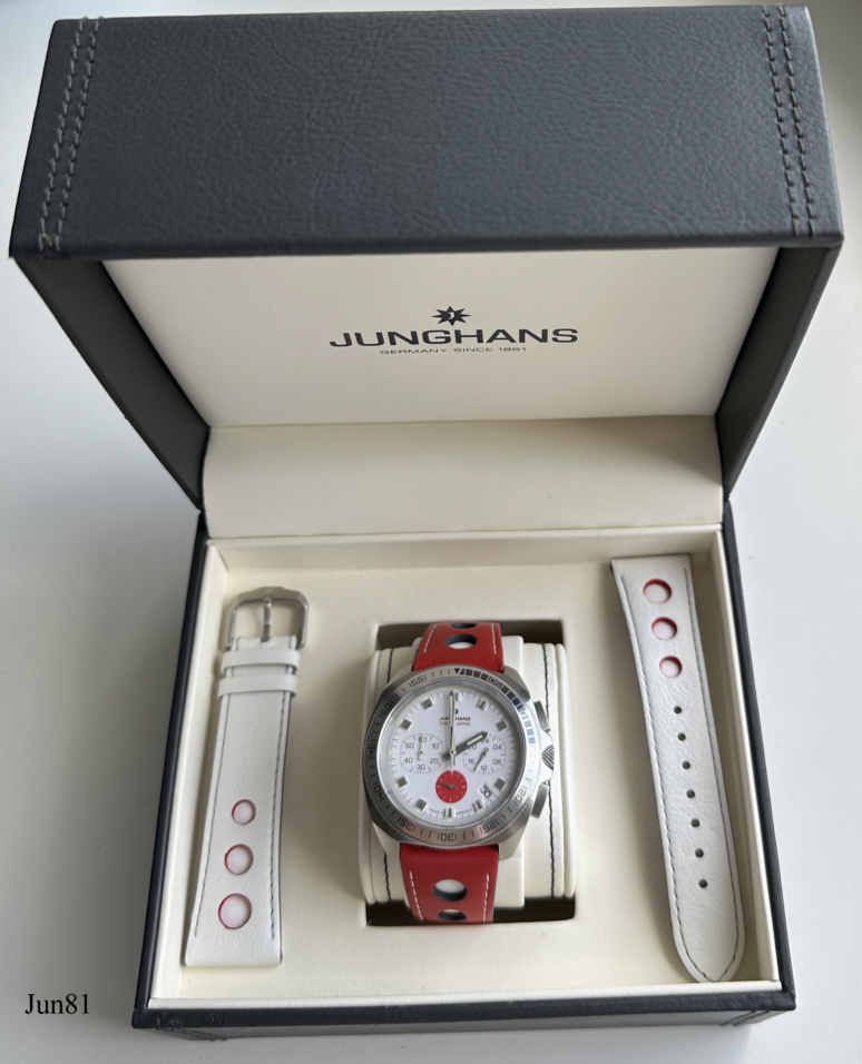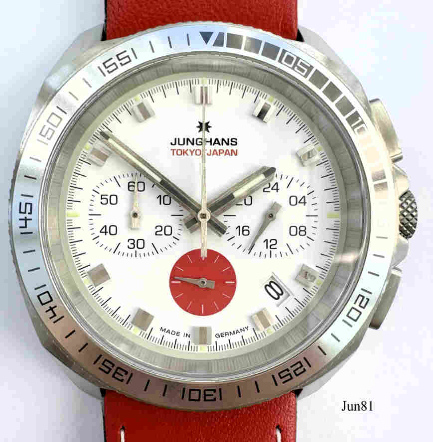 Dies ist ein Junghans Chronoscope Quartz Chronograph in Edelstahl Ausführung. Eine Limited Edition von 150 Stück, dies ist No. 022. Ausgegeben zur Olympiade 2020 in Tokio, die aber auf 2021 verschoben wurde. Beschriftet vorn: ”Junghans Tokyo Japan”, hinten: ”Edition No.022/150, 041/4067.00, Steel,10 Bar, Japan, Official Time Keeper Munich 1972”, innen: “SIIO, Japan, VK63A, No Jewels, Junghans”. Date bei der “4,5”. Kaliber 4067.00, Basiskaliber SIIO VK63A. Rotes und weißes Leder Armband.
