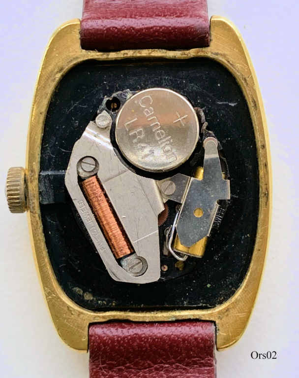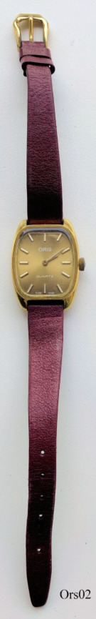 Eine Quartz Uhr der schweizer Marke Oris mit einem Quartzwerk der ESA, Kaliber 9220. Vergoldetes Base Metal Gehäuse und Stainless Steel Back. Beschriftung vorn: “Oris, Quartz, Swiss Made”, Rückseite: “Stainless Steel Back, Shock Resistant, Oris Watch Co Swiss” innen: ”Unadjusted, Five 5 Jewels, ESA 9220”, Braunes Lederarmband,