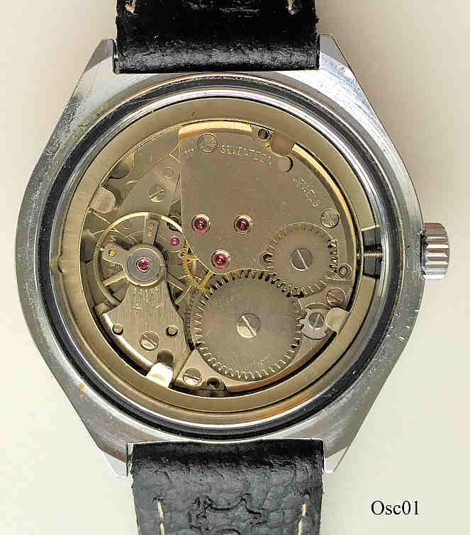 Dies ist eine Handaufzugsuhr von Osco, Kaliber France Ebauches 140-1B mit 17 Steinen. Inschrift vorn: “Osco, 17 Jewels, Shockproof ”, hinten: “Stainless Steel Back, Antimagnetic, Shockproof”, innen: “17 Seventeen Jewels, FE, 140-1B”. Schwarzes Leder Armband