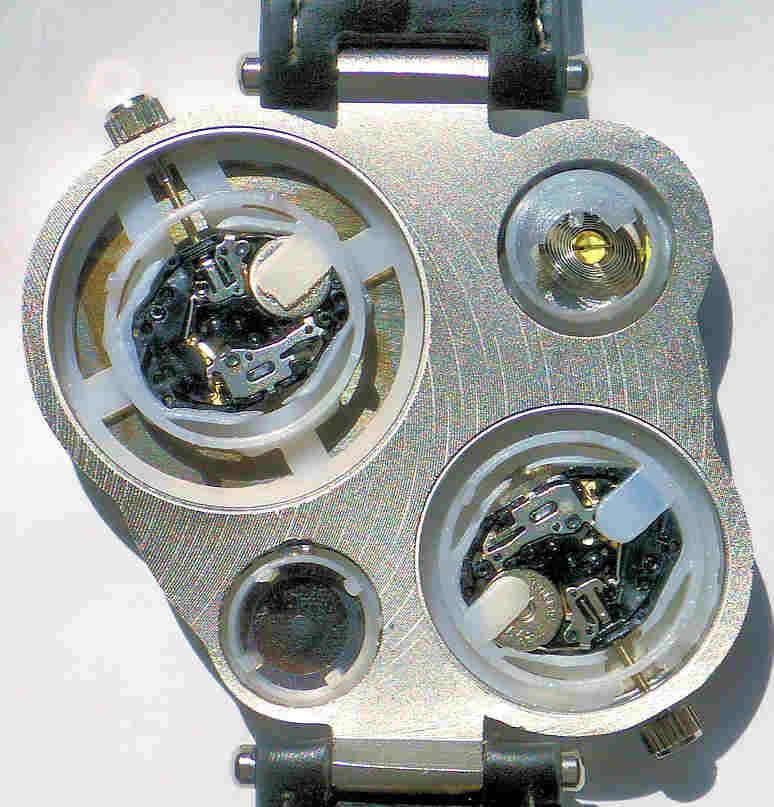 Eine sehr eigenwillige Quartzuhr im Militär Design mit zwei Uhrwerken, einem mechanischen Thermometer und einem mechanischen Kompaß. Beschriftung vorn: “Oulm”, innen:”SIIO, PC21S, Unadjusted, No 0 Jewels”, hinten auf beiden Uhrwerken: “Oulm, 9415, Stainless Steel Back, Japan Movt”. Schwarzes Lederarmband, gekauft neu in Box für einen Euro + Porto