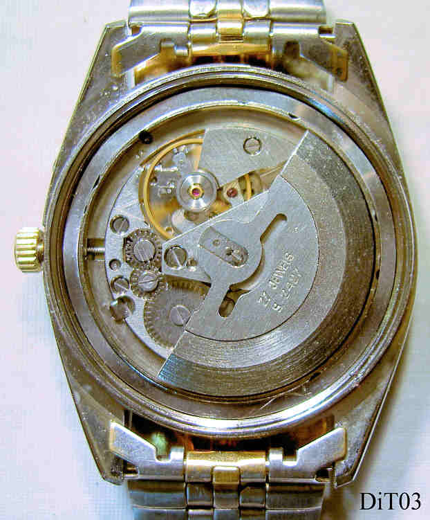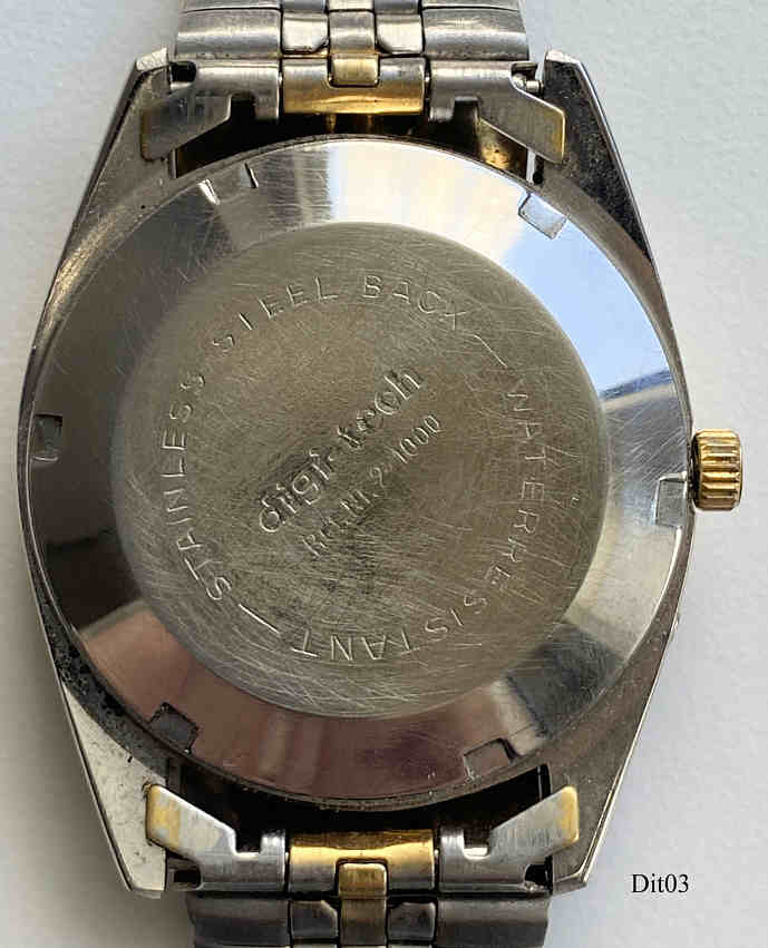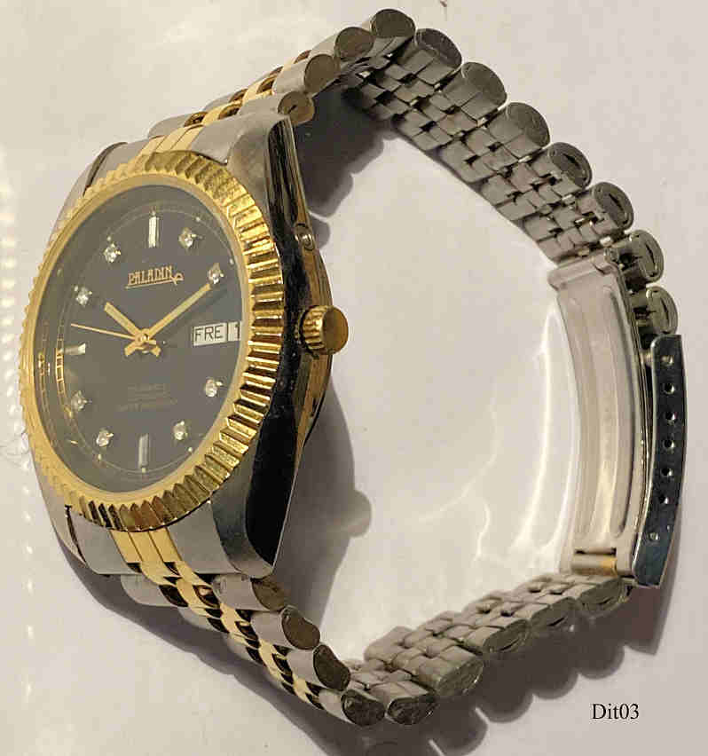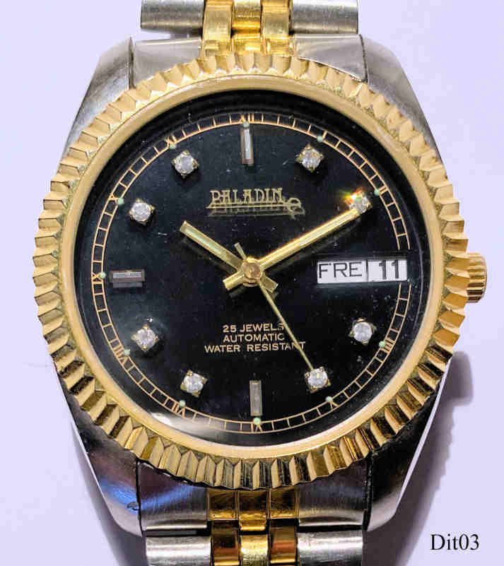 Dies ist eine Paladin Automaticuhr der Firma Digi Tech, Tag und Datum bei der 3. Schwarzes Zifferblatt mit Zirkon Applikationenstatt der Zahlen. Beschriftet vorn: ”Paladin, 25 Jewels, Automatic, Water Resistant”, hinten: ”Digi Tech,Ref. Nr. 2-1000, Stainless Steel Back, Water Resistant”, innen: “27 Jewels, S 2427”. Zweifarbiges Metall Armband, Slava Automatik Werk Kaliber 2427.