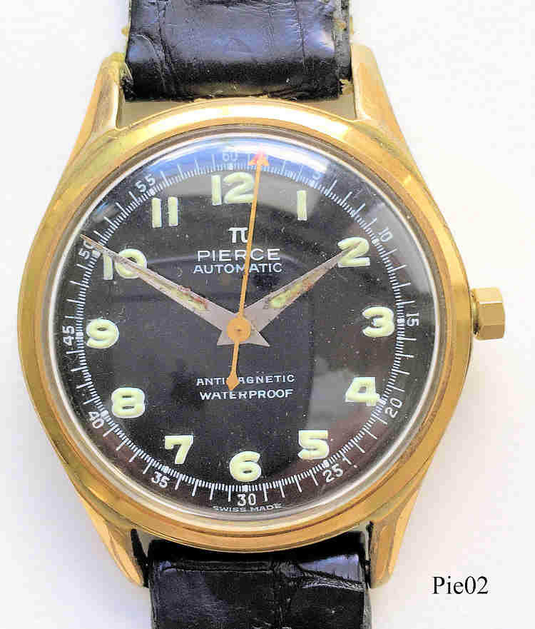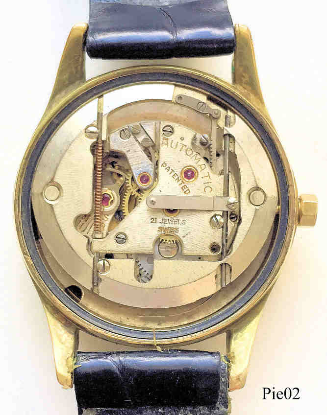 Dies ist eine Automatikuhr von Pierce mit 21 Steinen. Inschrift: “Pierce, Automatic, Antimagnetic, Waterproof, Swiss Made ”, hinten: “Swiss Made, 311199, Parashock, Stainless Steel Back,Waterproof, Antimagnetic”, innen: “Automatic, Patented, 21 Jewels, Swiss”. Verwendet wird hier das Exclusive Automatic Kaliber Pierce 861, die sogenannte “Rüttelautomatik”