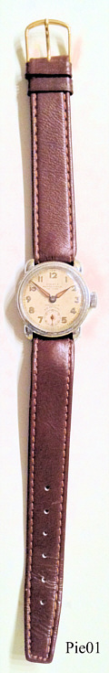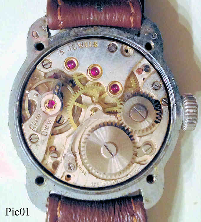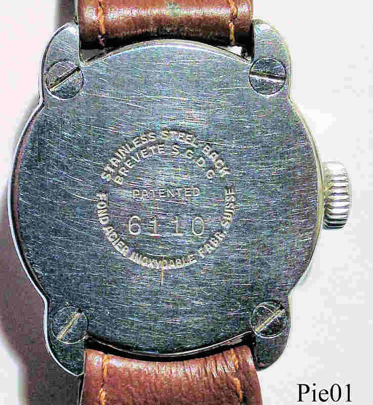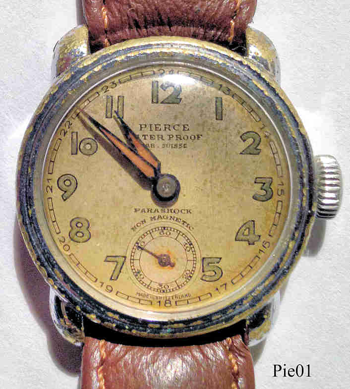 Dies ist eine Handaufzugsuhr von Pierce mit 15 Steinen. Inschrift: “ Pierce, Water Proof, Fab. Suisse, Parashock, Non Magnetic, Made in Switzerland ”, hinten: “Stainless Steel Back, Brevete S.G.D.G., Patented, 6110, Fond Acier Inoxydable, Fabr. Suisse”, innen: “15 Jewels, Swiss Made, Made in Switzerland”.