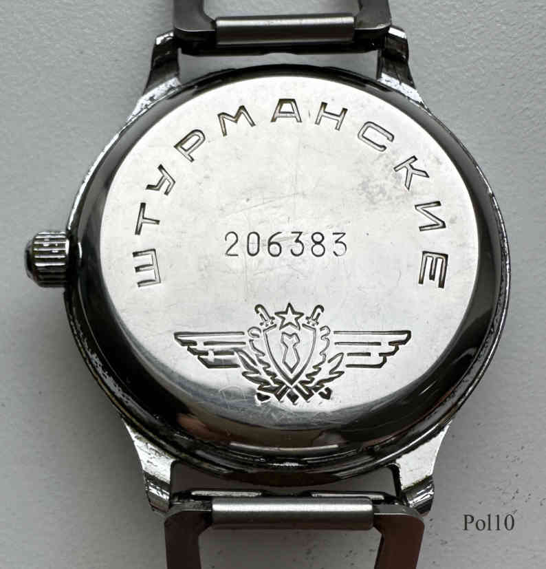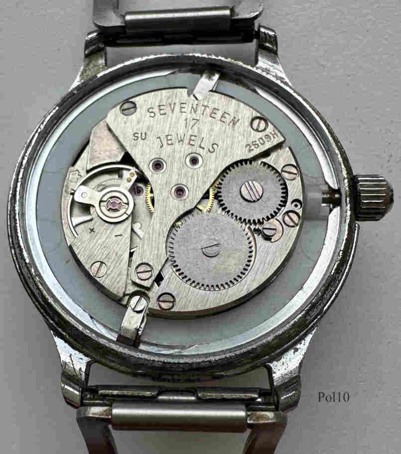 Ein Chronometer der Marke Poljot. Beschriftet vorn: “Chronometer, Wasserdicht bis 3 ATM”, hinten: ”€¯206383, “€¯, innen: ”Seventeen 17 Jewels, SU, 2509H”, Datum bei der 3, Edelstahl Armband. Die Eignung als Chronometer scheint mir sehr Zweifelhaft.