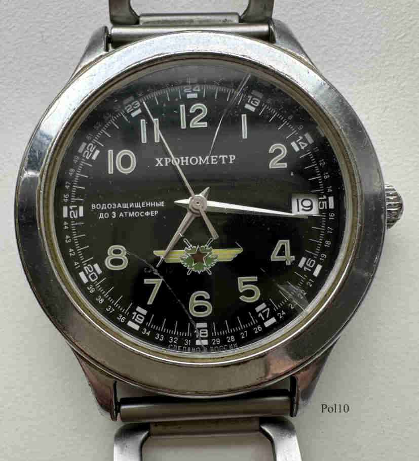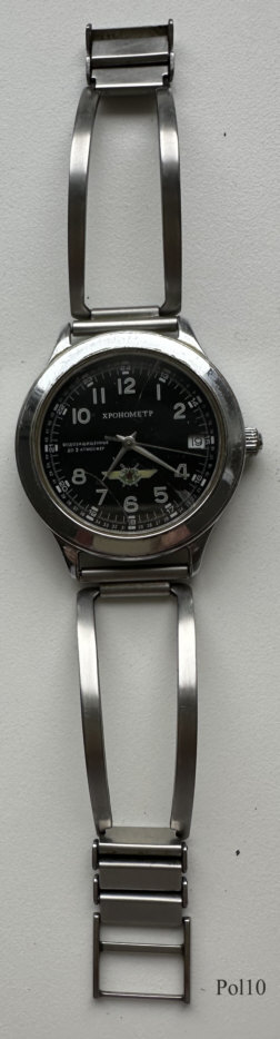 A Chronometer of the brand Poljot. Signed front: ”Chronometer, Waterproof up to 3 ATM”€¯, back: ”€¯206383, “, €¯inside: ”Seventeen 17 Jewels, SU, 2509H”, Date at ”3” Stainless steel band. Idoubt the quality of this watch to be a chronometer..